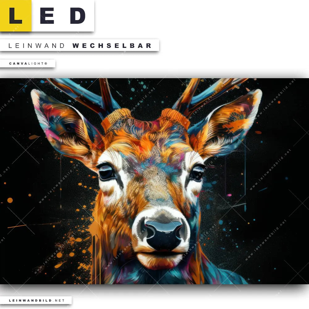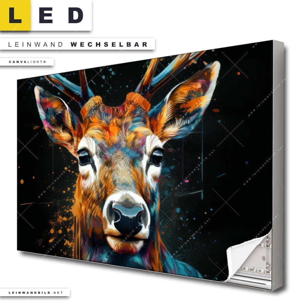 Du bist auf der Suche nach einem Tierwelt LED Leinwandbild im Querformat? Begriffe wie Hirsch, Natur, Rotwild, Wald, Farbspritzer, Farbexplosion haben Dich auf der Suche nach Deinem neuen XXL LED Wandbild mit wechselbarer Leinwand inspiriert? Farben wie Schwarz, Bunt dürfen auf Deinem neuen breiten Leinwand-LED-Bild nicht fehlen und Leuchtbilder im Modern Art, Pop Art, Abstrakt Stil passen perfekt zu Deinem Einrichtungsstil?