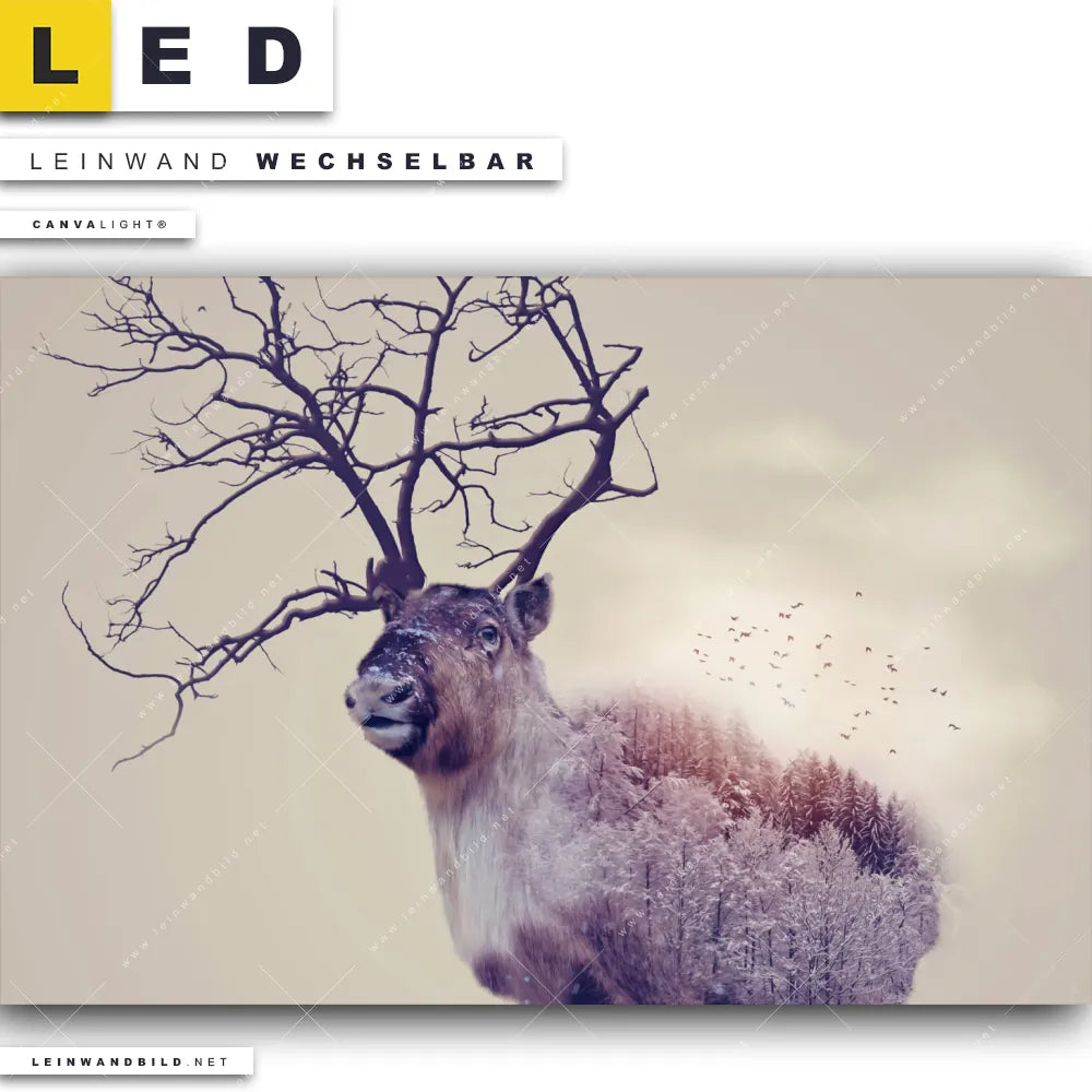 Du bist auf der Suche nach einem Tierwelt LED Leinwandbild im Querformat? Begriffe wie Hirsch, Deer, Wald, Doppelbelichtung, Natur, skandinavisch, Bäume, Rotwild, Reh haben Dich auf der Suche nach Deinem neuen XXL LED Wandbild mit wechselbarer Leinwand inspiriert? Farben wie Beige, Braun dürfen auf Deinem neuen breiten Leinwand-LED-Bild nicht fehlen und Leuchtbilder im Modern Art, Natürlich - Realistisch Stil passen perfekt zu Deinem Einrichtungsstil?
