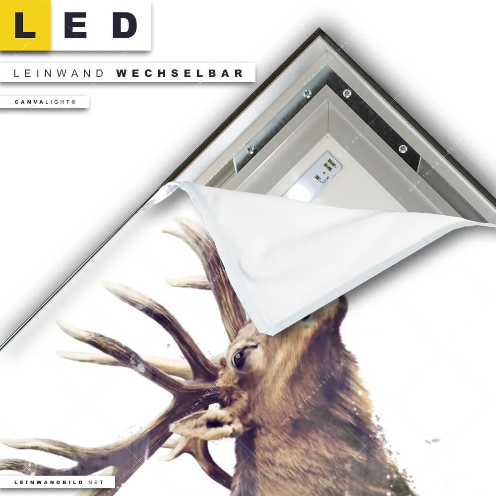 Du konfigurierst Dein individuelles LED Leinwandbild Canvalight® TEX | Hirsch & Wald No.2 | Querformat und wir produzieren es NEU für Dich. Unsere Tierwelt LED Bilder mit wechselbarer Textil-Leinwand sind KEINE Lagerware. Du bist Dir unsicher, welches Motiv oder Format das richtige für dein individuelles Canvalight® Leuchtbild ist, dann helfen wir dir gerne weiter und beraten dich!
