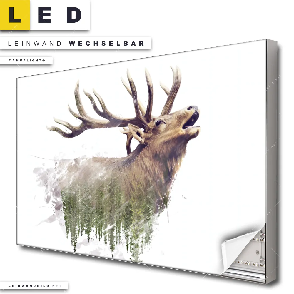 Du bist auf der Suche nach einem Tierwelt LED Leinwandbild im Querformat? Begriffe wie Hirsch, Deer, Wald, Doppelbelichtung, Natur, skandinavisch, Bäume, Rotwild, Reh haben Dich auf der Suche nach Deinem neuen XXL LED Wandbild mit wechselbarer Leinwand inspiriert? Farben wie Beige, Braun, Grün dürfen auf Deinem neuen breiten Leinwand-LED-Bild nicht fehlen und Leuchtbilder im Modern Art Stil passen perfekt zu Deinem Einrichtungsstil?