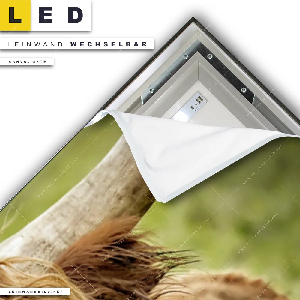 Du konfigurierst Dein individuelles LED Leinwandbild Canvalight® TEX | Hochland-Rind mit Nasenring | Panorama und wir produzieren es NEU für Dich. Unsere Tierwelt LED Bilder mit wechselbarer Textil-Leinwand sind KEINE Lagerware. Du bist Dir unsicher, welches Motiv oder Format das richtige für dein individuelles Canvalight® Leuchtbild ist, dann helfen wir dir gerne weiter und beraten dich!