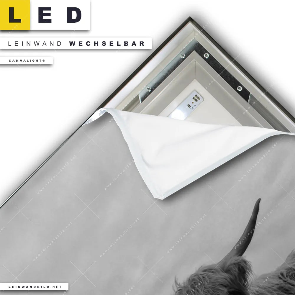 Du konfigurierst Dein individuelles LED Leinwandbild Canvalight® TEX | Hochland-Rind Schwarz-Weiß | Hochformat und wir produzieren es NEU für Dich. Unsere Tierwelt LED Bilder mit wechselbarer Textil-Leinwand sind KEINE Lagerware. Du bist Dir unsicher, welches Motiv oder Format das richtige für dein individuelles Canvalight® Leuchtbild ist, dann helfen wir dir gerne weiter und beraten dich!