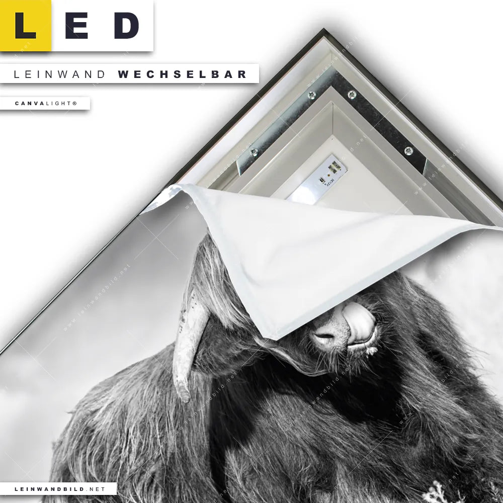 Du konfigurierst Dein individuelles LED Leinwandbild Canvalight® TEX | Hochlandkuh auf einer Wiese | Quadrat und wir produzieren es NEU für Dich. Unsere Tierwelt LED Bilder mit wechselbarer Textil-Leinwand sind KEINE Lagerware. Du bist Dir unsicher, welches Motiv oder Format das richtige für dein individuelles Canvalight® Leuchtbild ist, dann helfen wir dir gerne weiter und beraten dich!