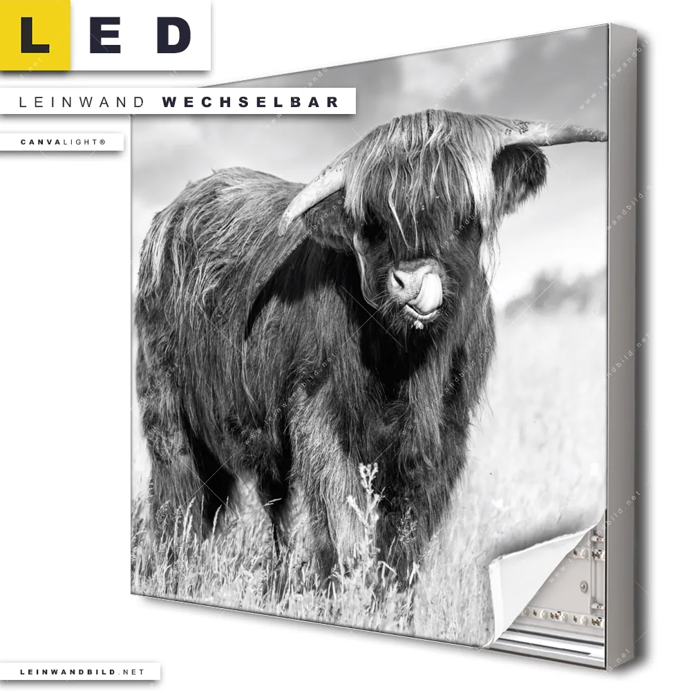 Dann sollte das LED Leinwandbild Canvalight® TEX | Hochlandkuh auf einer Wiese | Quadrat den Weg zu Dir finden. Das stufenlos dimmbare Leinwandbild Hochlandkuh schwarz-weiß im steckerfertigen Leuchtrahmen mit Fernbedienung und optionaler Farbtemperatursteuerung fügt sich als Eye-Catcher harmonisch in jedes Bar - Gastronomie, Wohnzimmer - Schlafzimmer, Küche - Esszimmer Raumkonzept ein.
