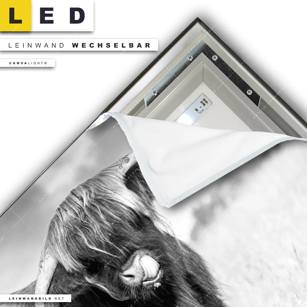 Du konfigurierst Dein individuelles LED Leinwandbild Canvalight® TEX | Hochlandkuh auf einer Wiese | Querformat und wir produzieren es NEU für Dich. Unsere Tierwelt LED Bilder mit wechselbarer Textil-Leinwand sind KEINE Lagerware. Du bist Dir unsicher, welches Motiv oder Format das richtige für dein individuelles Canvalight® Leuchtbild ist, dann helfen wir dir gerne weiter und beraten dich!
