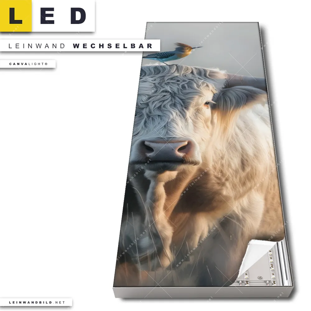 Dann sollte das LED Leinwandbild Canvalight® TEX | Hochlandrind & bunter Vogel | Schmal den Weg zu Dir finden. Das stufenlos dimmbare Leinwandbild Sanfte Stärke im steckerfertigen Leuchtrahmen mit Fernbedienung und optionaler Farbtemperatursteuerung fügt sich als Eye-Catcher harmonisch in jedes Bar - Gastronomie, Wohnzimmer - Schlafzimmer, Büro - Kanzlei Raumkonzept ein.