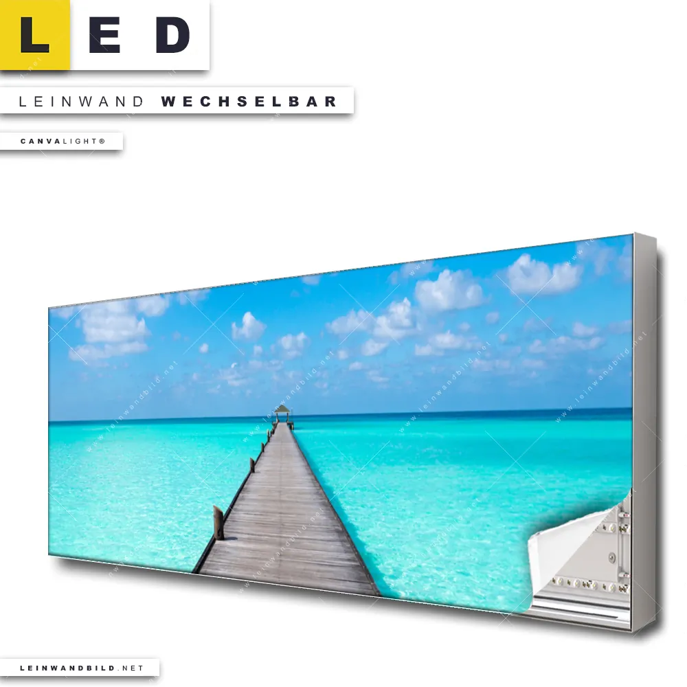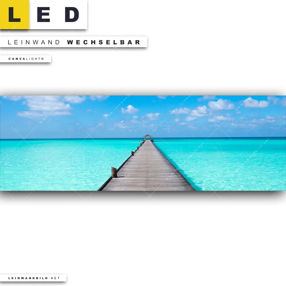 Du bist auf der Suche nach einem Strand - Meer, Landschaften LED Leinwandbild im Panorama-Format? Begriffe wie Meer, Steg, Strand, Sommer, Weg, Südsee - Karibik, Urlaub - Reisen haben Dich auf der Suche nach Deinem neuen XXL LED Wandbild mit wechselbarer Leinwand inspiriert? Farben wie Blau, Türkis dürfen auf Deinem neuen extra breiten Leinwand-LED-Bild nicht fehlen und Leuchtbilder im Natürlich - Realistisch Stil passen perfekt zu Deinem Einrichtungsstil?