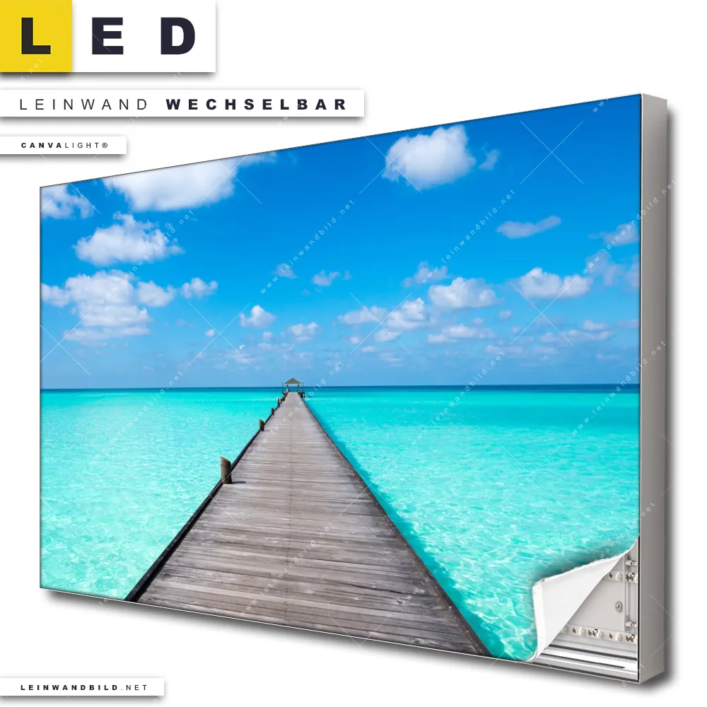 Du bist auf der Suche nach einem Strand - Meer, Landschaften LED Leinwandbild im Querformat? Begriffe wie Meer, Steg, Strand, Sommer, Weg, Südsee - Karibik, Urlaub - Reisen haben Dich auf der Suche nach Deinem neuen XXL LED Wandbild mit wechselbarer Leinwand inspiriert? Farben wie Blau, Türkis dürfen auf Deinem neuen breiten Leinwand-LED-Bild nicht fehlen und Leuchtbilder im Natürlich - Realistisch Stil passen perfekt zu Deinem Einrichtungsstil?