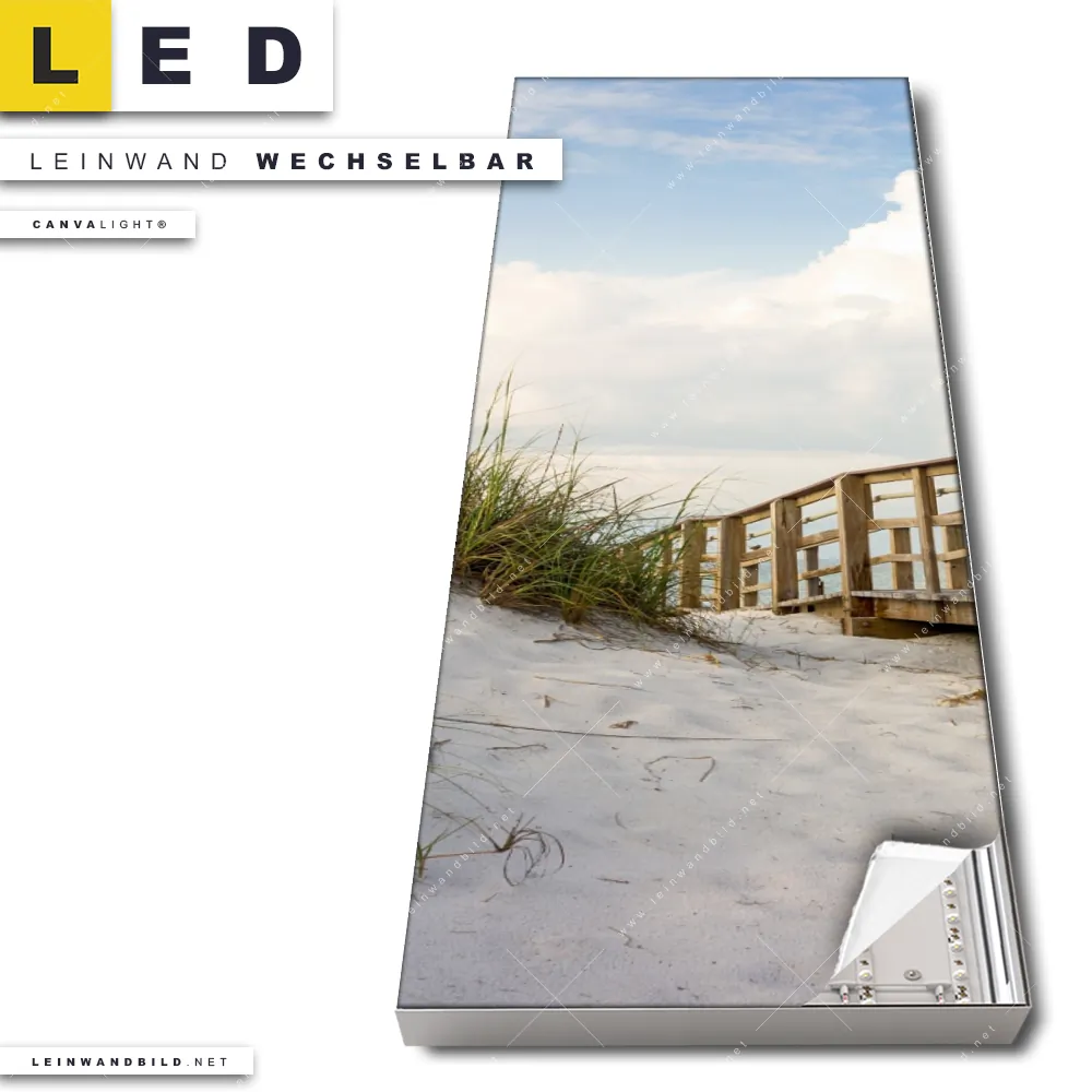 Du konfigurierst Dein individuelles LED Leinwandbild Canvalight® TEX | Holzsteg & Dünen | Schmal und wir produzieren es NEU für Dich. Unsere Landschaften, Strand - Meer LED Bilder mit wechselbarer Textil-Leinwand sind KEINE Lagerware. Du bist Dir unsicher, welches Motiv oder Format das richtige für dein individuelles Canvalight® Leuchtbild ist, dann helfen wir dir gerne weiter und beraten dich!