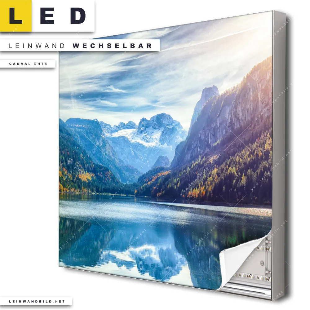 Dann sollte das LED Leinwandbild Canvalight® TEX | Idyllischer Bergsee im Gebirge | Quadrat den Weg zu Dir finden. Das stufenlos dimmbare Leinwandbild Herbst im Hochgebirge im steckerfertigen Leuchtrahmen mit Fernbedienung und optionaler Farbtemperatursteuerung fügt sich als Eye-Catcher harmonisch in jedes Wohnzimmer - Schlafzimmer, Flur - Eingangsbereich, Büro - Kanzlei, Bar - Gastronomie, Arzt - Praxis Raumkonzept ein.