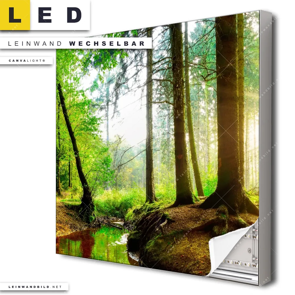 Du konfigurierst Dein individuelles LED Leinwandbild Canvalight® TEX | Idyllischer Wald bei Sonnenaufgang | Quadrat und wir produzieren es NEU für Dich. Unsere Landschaften, Wald - Bäume LED Bilder mit wechselbarer Textil-Leinwand sind KEINE Lagerware. Du bist Dir unsicher, welches Motiv oder Format das richtige für dein individuelles Canvalight® Leuchtbild ist, dann helfen wir dir gerne weiter und beraten dich!