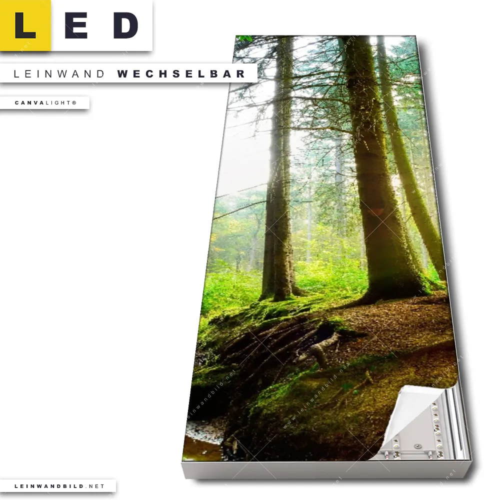 Du konfigurierst Dein individuelles LED Leinwandbild Canvalight® TEX | Idyllischer Wald bei Sonnenaufgang | Schmal und wir produzieren es NEU für Dich. Unsere Landschaften, Wald - Bäume LED Bilder mit wechselbarer Textil-Leinwand sind KEINE Lagerware. Du bist Dir unsicher, welches Motiv oder Format das richtige für dein individuelles Canvalight® Leuchtbild ist, dann helfen wir dir gerne weiter und beraten dich!
