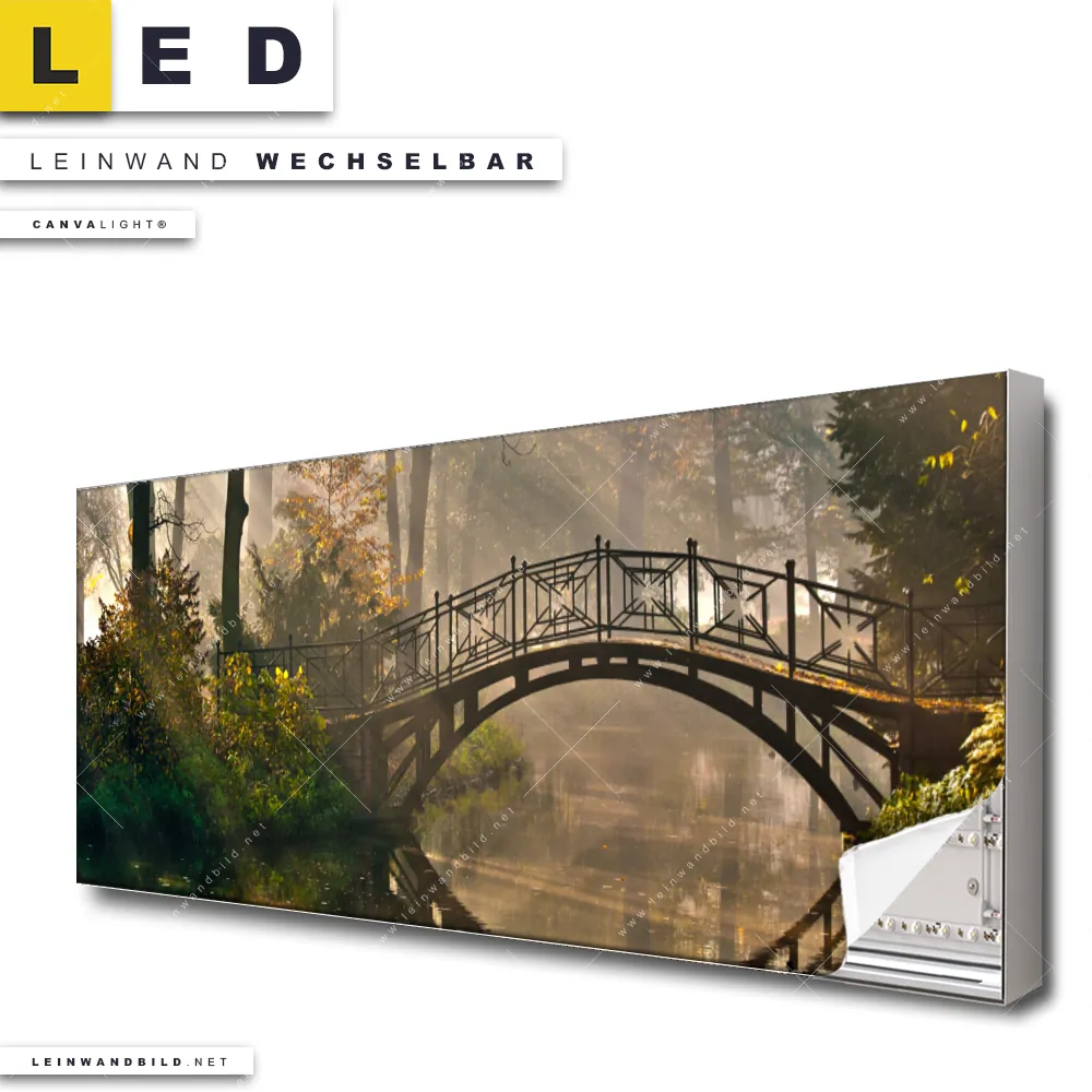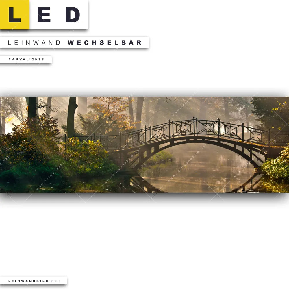 LED Leinwandbild Canvalight® TEX | Idyllischer Wald mit Brücke | Panorama