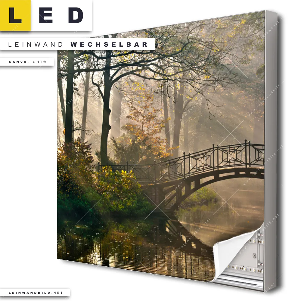 LED Leinwandbild Canvalight® TEX | Idyllischer Wald mit Brücke | Quadrat