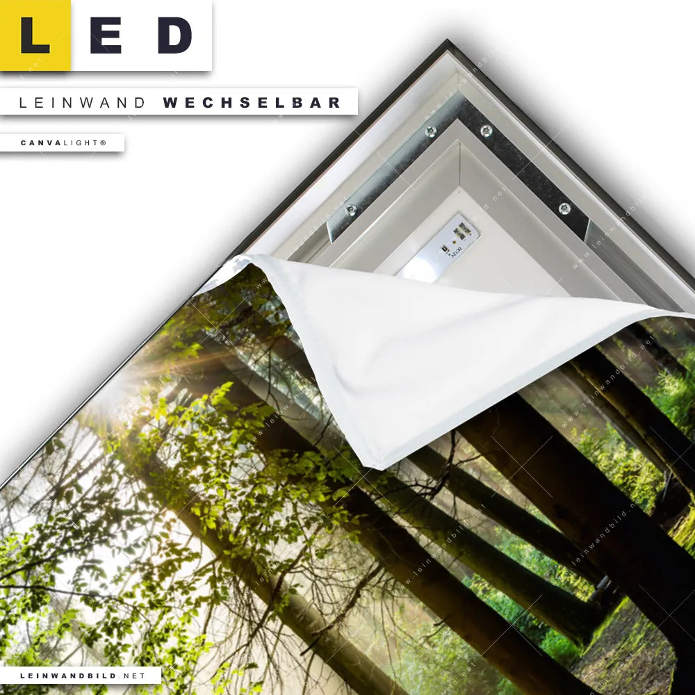 Du konfigurierst Dein individuelles LED Leinwandbild Canvalight® TEX | Im Wald | Querformat und wir produzieren es NEU für Dich. Unsere Landschaften, Wald - Bäume LED Bilder mit wechselbarer Textil-Leinwand sind KEINE Lagerware. Du bist Dir unsicher, welches Motiv oder Format das richtige für dein individuelles Canvalight® Leuchtbild ist, dann helfen wir dir gerne weiter und beraten dich!