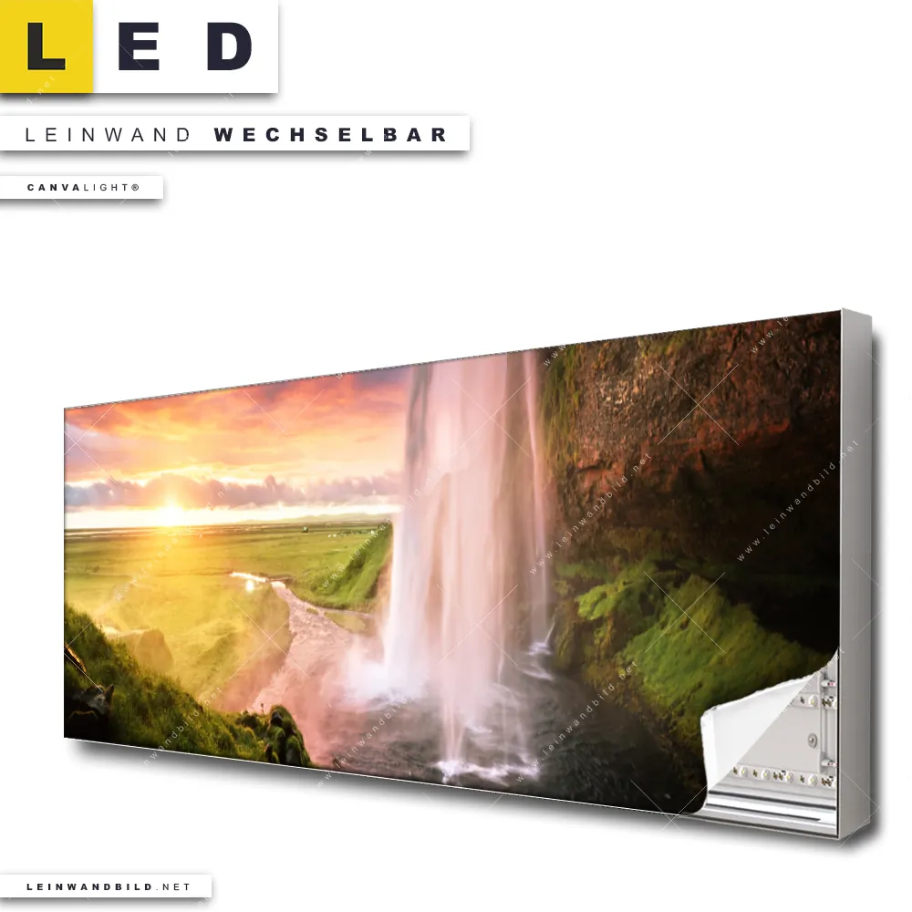 Du konfigurierst Dein individuelles LED Leinwandbild Canvalight® TEX | Isländischer Wasserfall | Panorama und wir produzieren es NEU für Dich. Unsere Landschaften LED Bilder mit wechselbarer Textil-Leinwand sind KEINE Lagerware. Du bist Dir unsicher, welches Motiv oder Format das richtige für dein individuelles Canvalight® Leuchtbild ist, dann helfen wir dir gerne weiter und beraten dich!