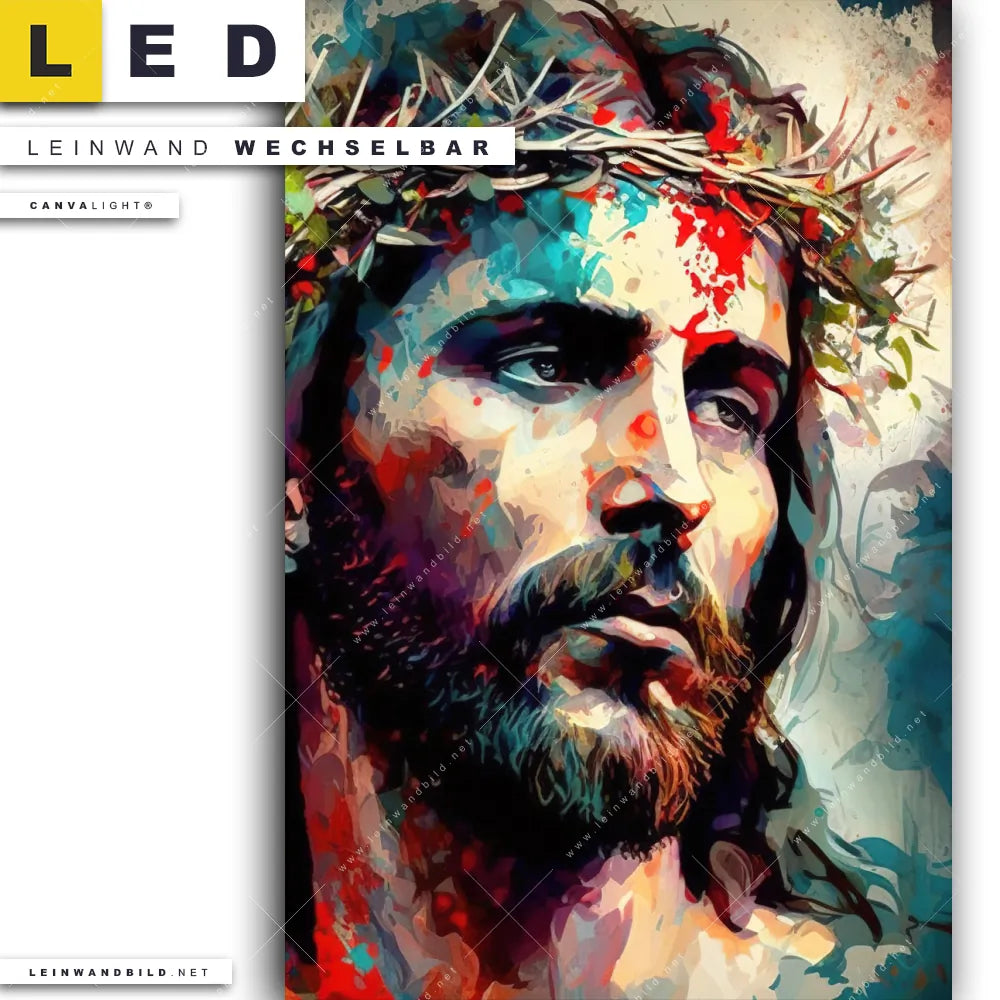 Dann sollte das LED Leinwandbild Canvalight® TEX | Jesus Christus mit Dornenkrone | Hochformat den Weg zu Dir finden. Das stufenlos dimmbare Leinwandbild Passion und Farbenspie im steckerfertigen Leuchtrahmen mit Fernbedienung und optionaler Farbtemperatursteuerung fügt sich als Eye-Catcher harmonisch in jedes Wohnzimmer - Schlafzimmer, Büro - Kanzlei, Flur - Eingangsbereich Raumkonzept ein.