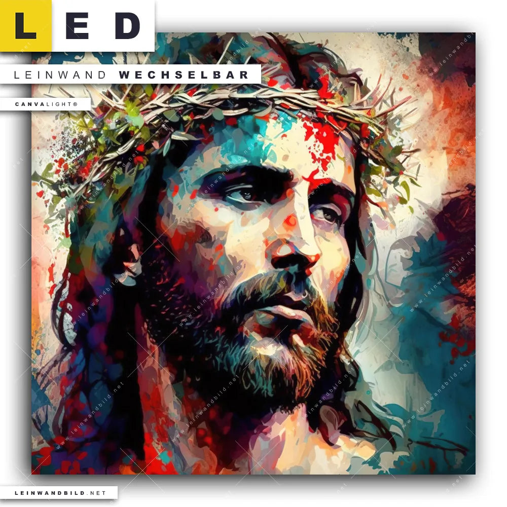 Dann sollte das LED Leinwandbild Canvalight® TEX | Jesus Christus mit Dornenkrone | Quadrat den Weg zu Dir finden. Das stufenlos dimmbare Leinwandbild Passion und Farbenspie im steckerfertigen Leuchtrahmen mit Fernbedienung und optionaler Farbtemperatursteuerung fügt sich als Eye-Catcher harmonisch in jedes Wohnzimmer - Schlafzimmer, Büro - Kanzlei, Flur - Eingangsbereich Raumkonzept ein.