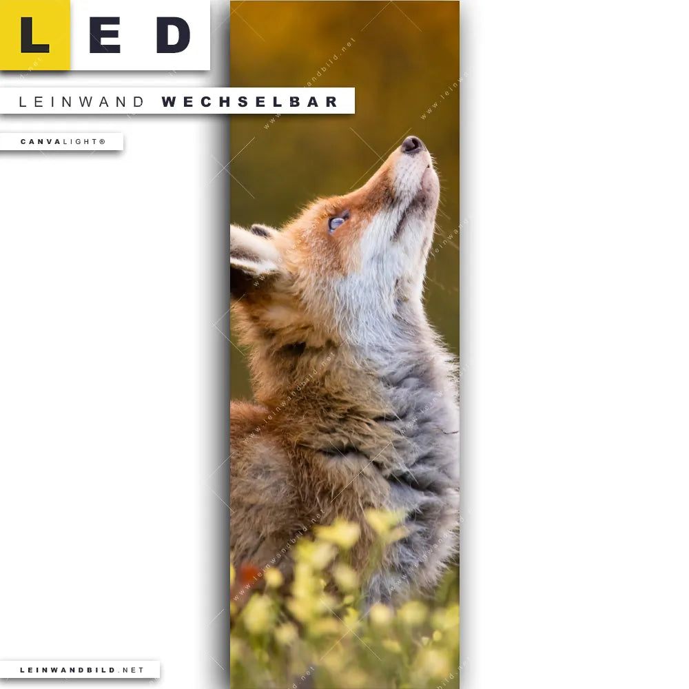 Du bist auf der Suche nach einem Landschaften, Tierwelt LED Leinwandbild im Schmalen Format? Begriffe wie Fuchs, Wald, Bäume, Natur, Wild, Wiese, Weide, Feld haben Dich auf der Suche nach Deinem neuen XXL LED Wandbild mit wechselbarer Leinwand inspiriert? Farben wie Orange, Grün dürfen auf Deinem neuen Leinwand-LED-Bild im Panorama-Hochformat nicht fehlen und Leuchtbilder im Natürlich - Realistisch Stil passen perfekt zu Deinem Einrichtungsstil?