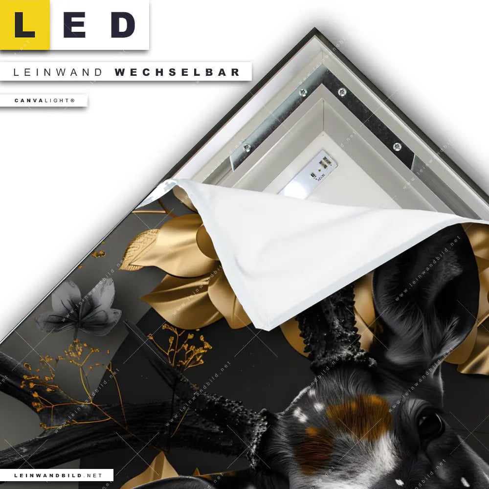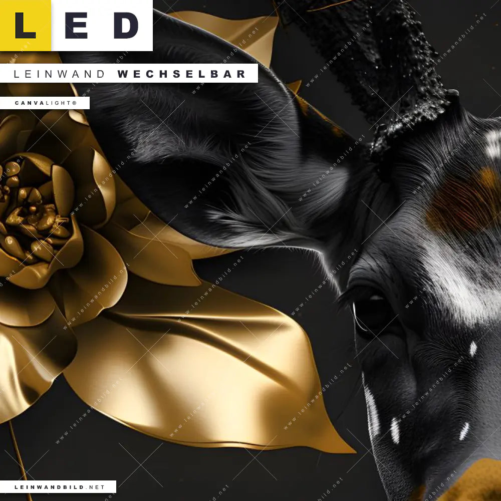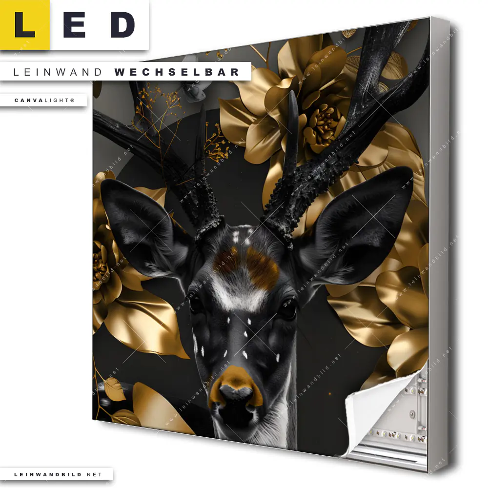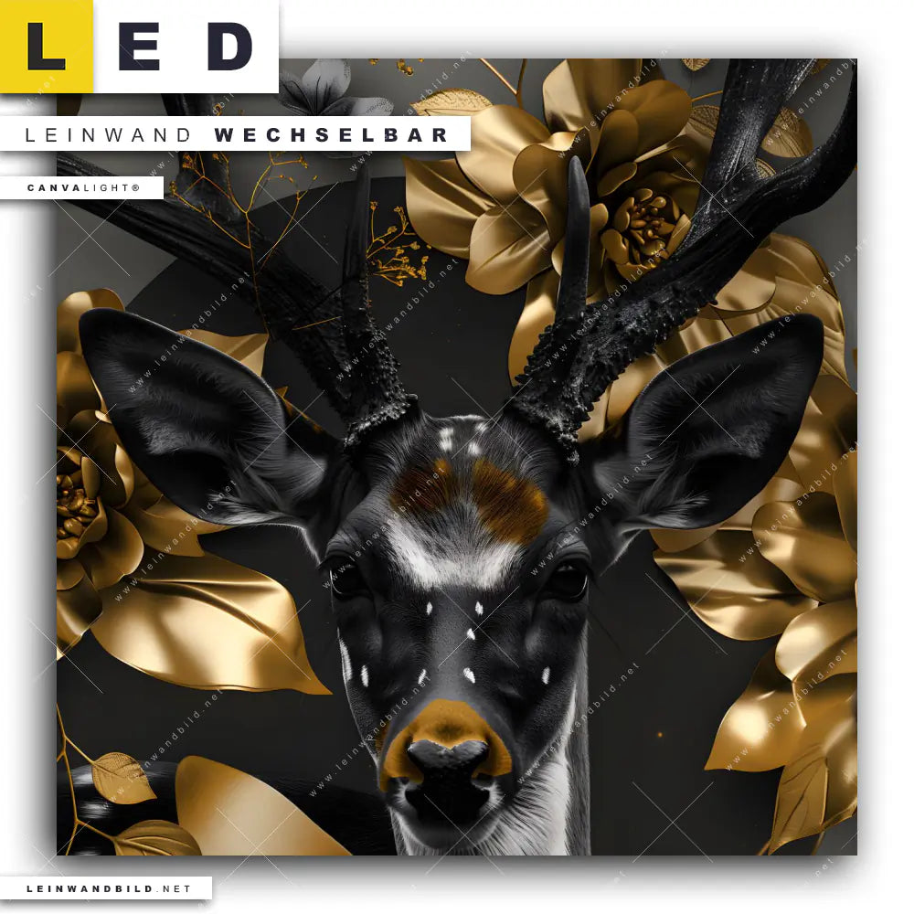 Du bist auf der Suche nach einem Tierwelt, Blumen - Botanik LED Leinwandbild im Quadratischen Format? Begriffe wie Tierporträt, Hirsch, Blüten, Rotwild, Geweih, Blumen, Rothirsch haben Dich auf der Suche nach Deinem neuen XXL LED Wandbild mit wechselbarer Leinwand inspiriert? Farben wie Schwarz, Gold, Grau dürfen auf Deinem neuen Leinwand-LED-Bild nicht fehlen und Leuchtbilder im Floral, Modern Art Stil passen perfekt zu Deinem Einrichtungsstil?