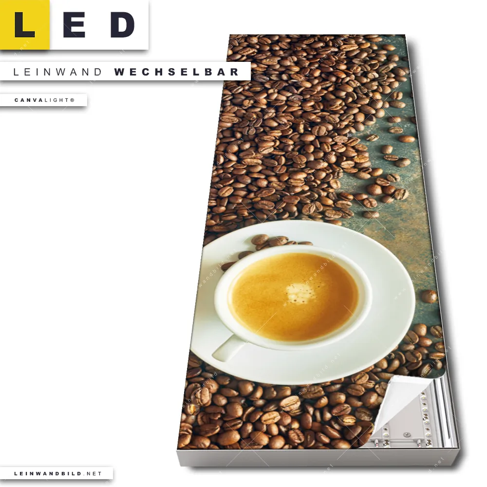 Du konfigurierst Dein individuelles LED Leinwandbild Canvalight® TEX | Kaffee-Genuss | Schmal und wir produzieren es NEU für Dich. Unsere Essen - Trinken LED Bilder mit wechselbarer Textil-Leinwand sind KEINE Lagerware. Du bist Dir unsicher, welches Motiv oder Format das richtige für dein individuelles Canvalight® Leuchtbild ist, dann helfen wir dir gerne weiter und beraten dich!
