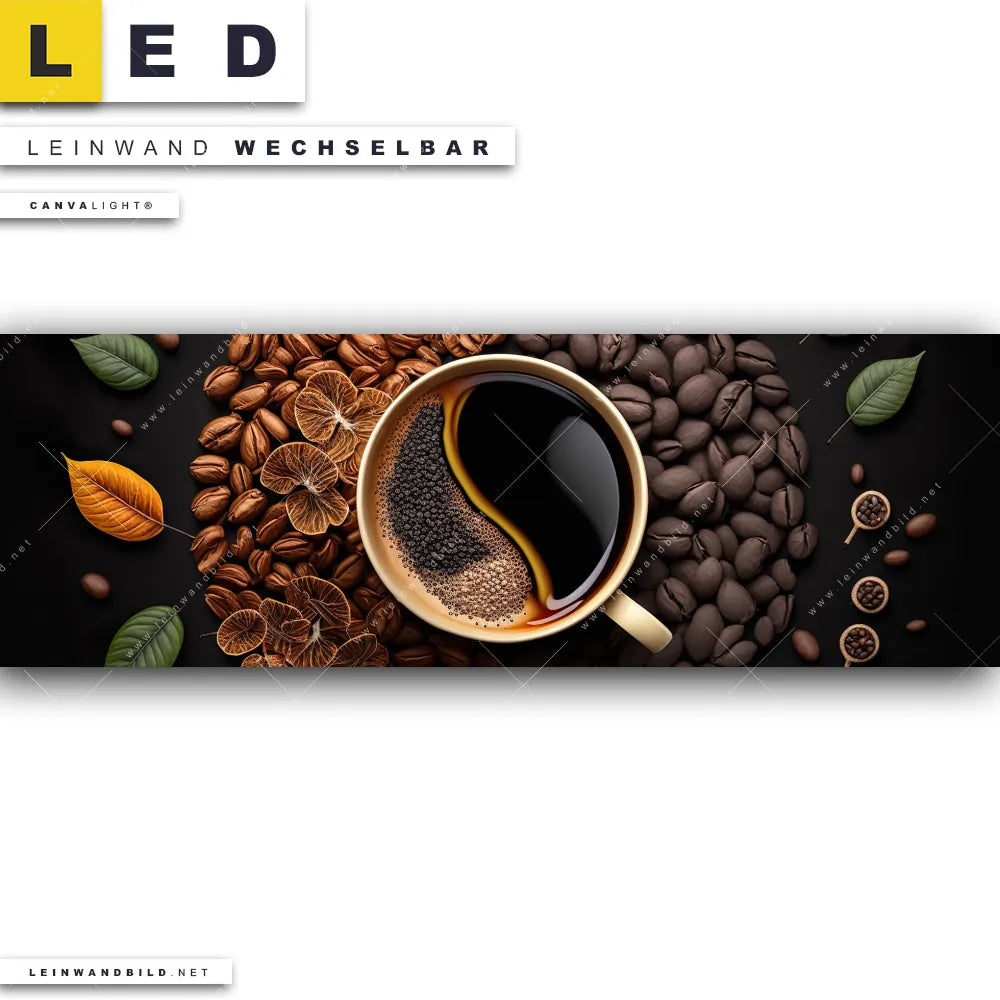 Du bist auf der Suche nach einem Essen - Trinken LED Leinwandbild im Panorama-Format? Begriffe wie Kaffee, Coffee, Küche, Kaffebohnen, Blätter, Tasse haben Dich auf der Suche nach Deinem neuen XXL LED Wandbild mit wechselbarer Leinwand inspiriert? Farben wie Braun, Grün, Orange dürfen auf Deinem neuen extra breiten Leinwand-LED-Bild nicht fehlen und Leuchtbilder im Modern Art, Floral Stil passen perfekt zu Deinem Einrichtungsstil?