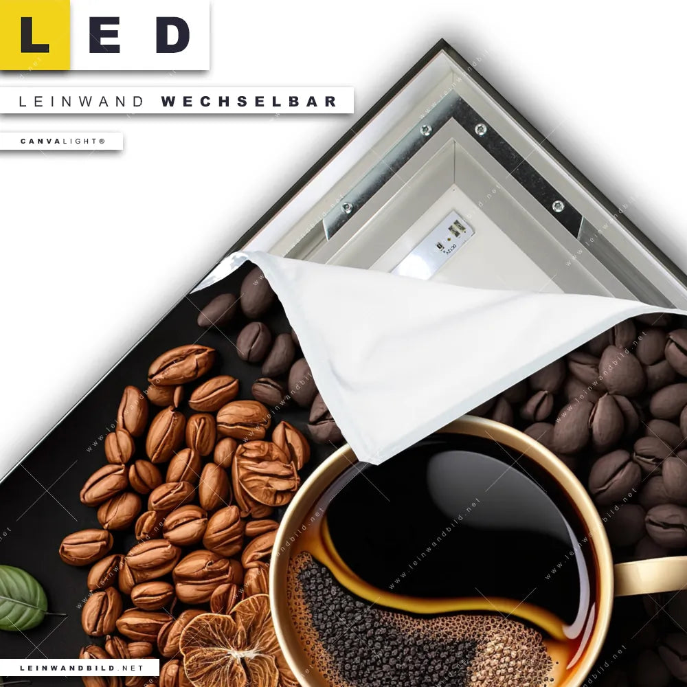 Du bist auf der Suche nach einem Essen - Trinken LED Leinwandbild im Quadratischen Format? Begriffe wie Kaffee, Coffee, Küche, Kaffebohnen, Blätter, Tasse haben Dich auf der Suche nach Deinem neuen XXL LED Wandbild mit wechselbarer Leinwand inspiriert? Farben wie Braun, Grün, Orange dürfen auf Deinem neuen Leinwand-LED-Bild nicht fehlen und Leuchtbilder im Modern Art, Floral Stil passen perfekt zu Deinem Einrichtungsstil?