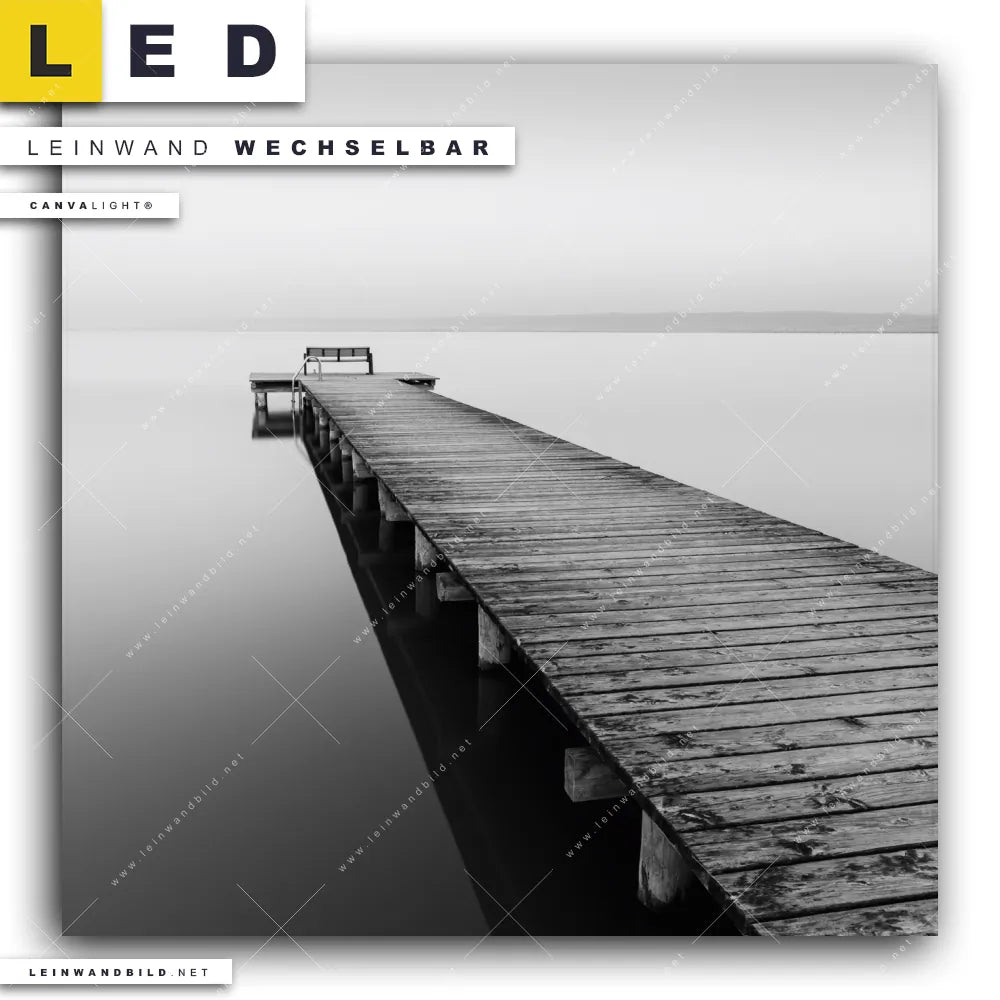 Dann sollte das LED Leinwandbild Canvalight® TEX | Kalter Morgen am Meer | Quadrat den Weg zu Dir finden. Das stufenlos dimmbare Leinwandbild Steg ins Meer scchwarz-weiß im steckerfertigen Leuchtrahmen mit Fernbedienung und optionaler Farbtemperatursteuerung fügt sich als Eye-Catcher harmonisch in jedes Wohnzimmer - Schlafzimmer, Büro - Kanzlei Raumkonzept ein.