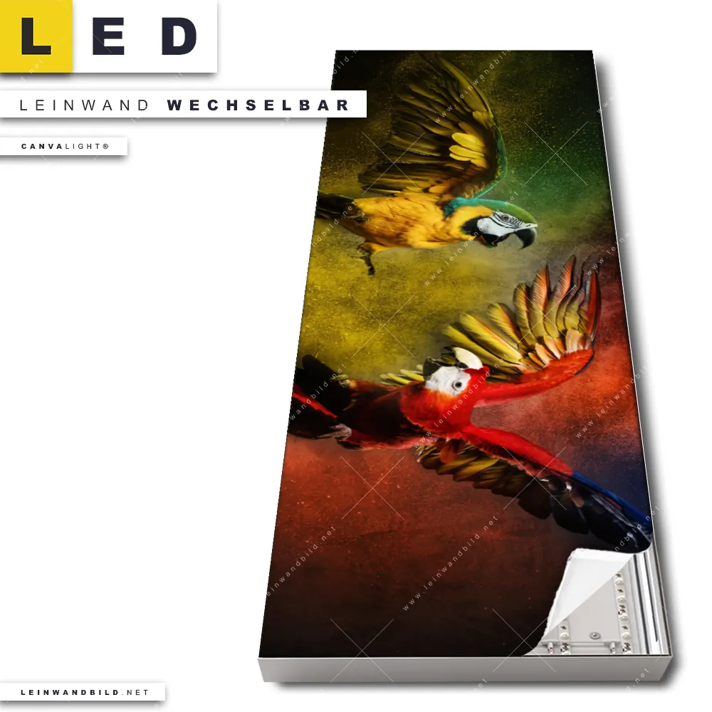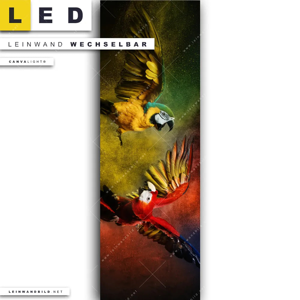 LED Leinwandbild Canvalight® TEX | Kampf der Papageien | Schmal