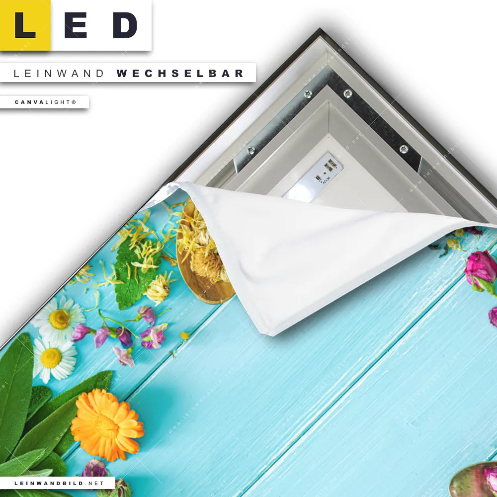 Du konfigurierst Dein individuelles LED Leinwandbild Canvalight® TEX | Kräuter auf blauem Holztisch | Quadrat und wir produzieren es NEU für Dich. Unsere Essen - Trinken, Blumen - Botanik LED Bilder mit wechselbarer Textil-Leinwand sind KEINE Lagerware. Du bist Dir unsicher, welches Motiv oder Format das richtige für dein individuelles Canvalight® Leuchtbild ist, dann helfen wir dir gerne weiter und beraten dich!