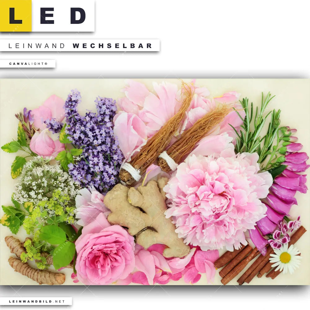 Du bist auf der Suche nach einem Essen - Trinken, Blumen - Botanik LED Leinwandbild im Querformat? Begriffe wie Gewürze, Kräuter, kochen, Pfeffer, Salz, Curry, Chili, Blumen, Blüten, Ingwer, Rosen haben Dich auf der Suche nach Deinem neuen XXL LED Wandbild mit wechselbarer Leinwand inspiriert? Farben wie Grün, Rosa, Lila, Pink, Braun, Beige dürfen auf Deinem neuen breiten Leinwand-LED-Bild nicht fehlen und Leuchtbilder im Modern Art, Natürlich - Realistisch Stil passen perfekt zu Deinem Einrichtungsstil?