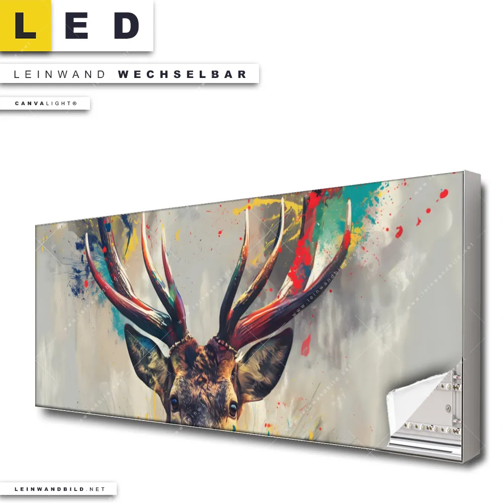 Du bist auf der Suche nach einem Tierwelt LED Leinwandbild im Panorama-Format? Begriffe wie Hirsch, Geweih, Magie, Rotwild, Rothirsch, Farbexplosion, Farbspritzer haben Dich auf der Suche nach Deinem neuen XXL LED Wandbild mit wechselbarer Leinwand inspiriert? Farben wie Bunt, Grau , Braun dürfen auf Deinem neuen extra breiten Leinwand-LED-Bild nicht fehlen und Leuchtbilder im Abstrakt, Pop Art Stil passen perfekt zu Deinem Einrichtungsstil?