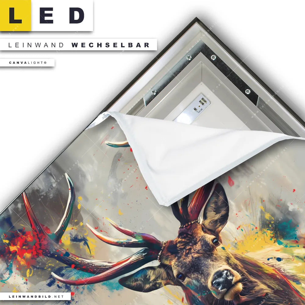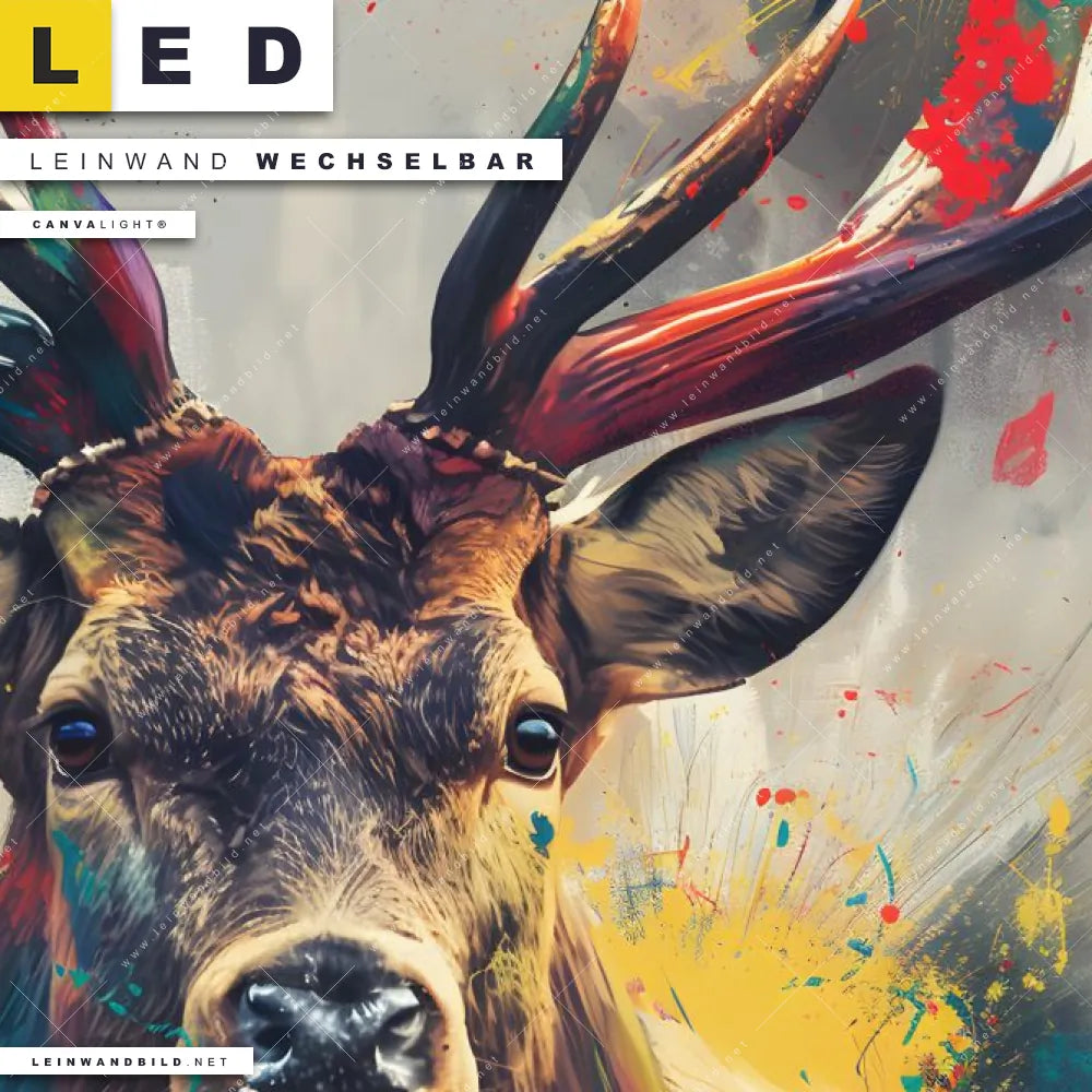 Du konfigurierst Dein individuelles LED Leinwandbild Canvalight® TEX | Kreativer Hirsch mit Farbspritzern | Quadrat und wir produzieren es NEU für Dich. Unsere Tierwelt LED Bilder mit wechselbarer Textil-Leinwand sind KEINE Lagerware. Du bist Dir unsicher, welches Motiv oder Format das richtige für dein individuelles Canvalight® Leuchtbild ist, dann helfen wir dir gerne weiter und beraten dich!