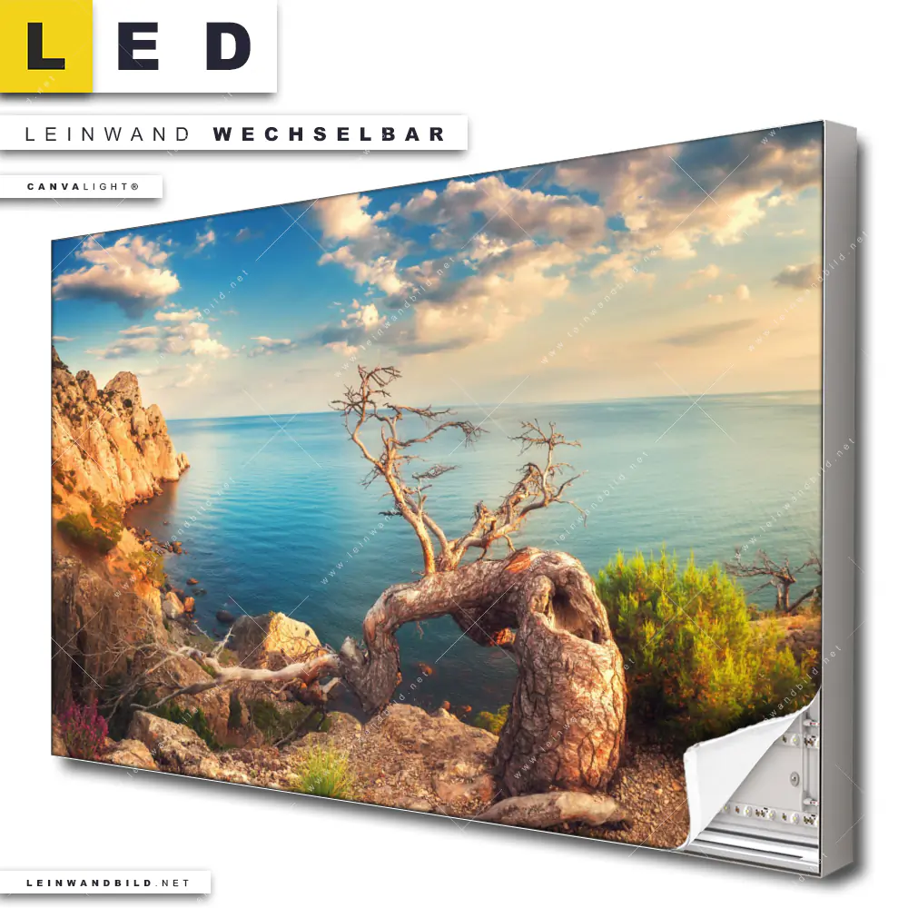 Du konfigurierst Dein individuelles LED Leinwandbild Canvalight® TEX | Küstenlandschaft mit altem Baum | Querformat und wir produzieren es NEU für Dich. Unsere Landschaften, Strand - Meer LED Bilder mit wechselbarer Textil-Leinwand sind KEINE Lagerware. Du bist Dir unsicher, welches Motiv oder Format das richtige für dein individuelles Canvalight® Leuchtbild ist, dann helfen wir dir gerne weiter und beraten dich!
