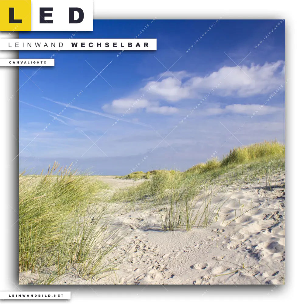 Du bist auf der Suche nach einem Landschaften, Strand - Meer LED Leinwandbild im Quadratischen Format? Begriffe wie Deutschland, Sommer, Dünen, Gräser, Urlaub, Reisen, Ostsee, Nordsee, Strand, Meer, Sand haben Dich auf der Suche nach Deinem neuen XXL LED Wandbild mit wechselbarer Leinwand inspiriert? Farben wie Beige, Blau, Grün dürfen auf Deinem neuen Leinwand-LED-Bild nicht fehlen und Leuchtbilder im Natürlich - Realistisch Stil passen perfekt zu Deinem Einrichtungsstil?