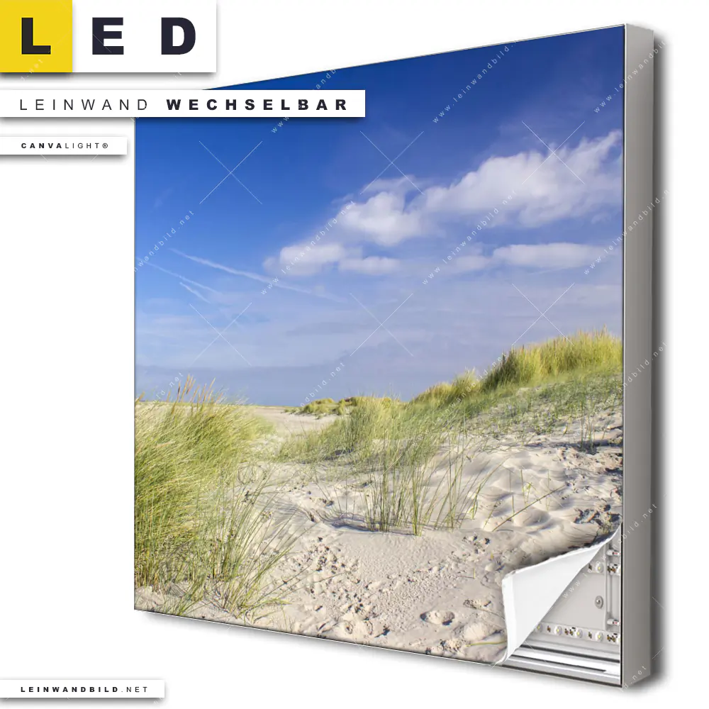Du konfigurierst Dein individuelles LED Leinwandbild Canvalight® TEX | Küstenwanderung durch Sanddünen | Quadrat und wir produzieren es NEU für Dich. Unsere Landschaften, Strand - Meer LED Bilder mit wechselbarer Textil-Leinwand sind KEINE Lagerware. Du bist Dir unsicher, welches Motiv oder Format das richtige für dein individuelles Canvalight® Leuchtbild ist, dann helfen wir dir gerne weiter und beraten dich!
