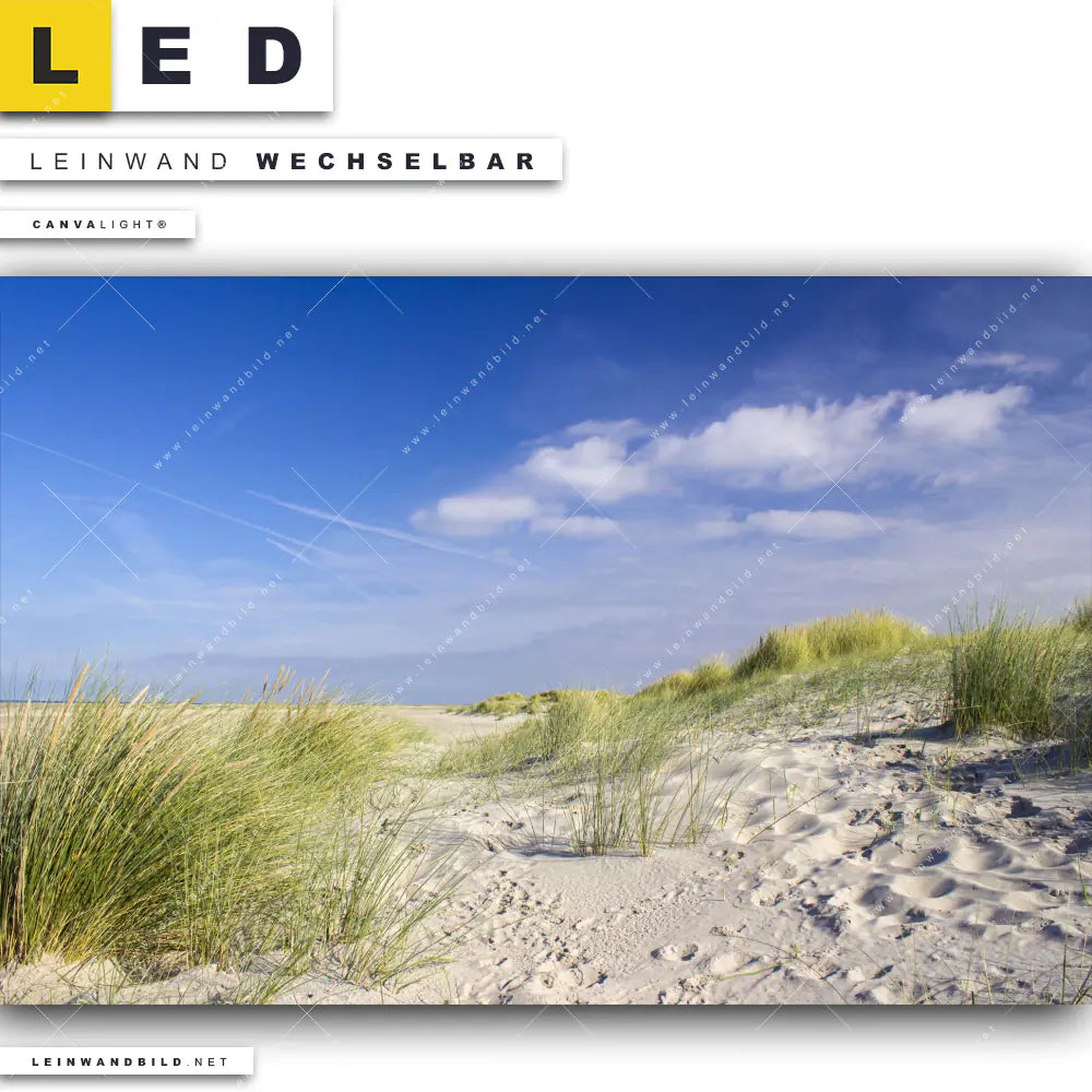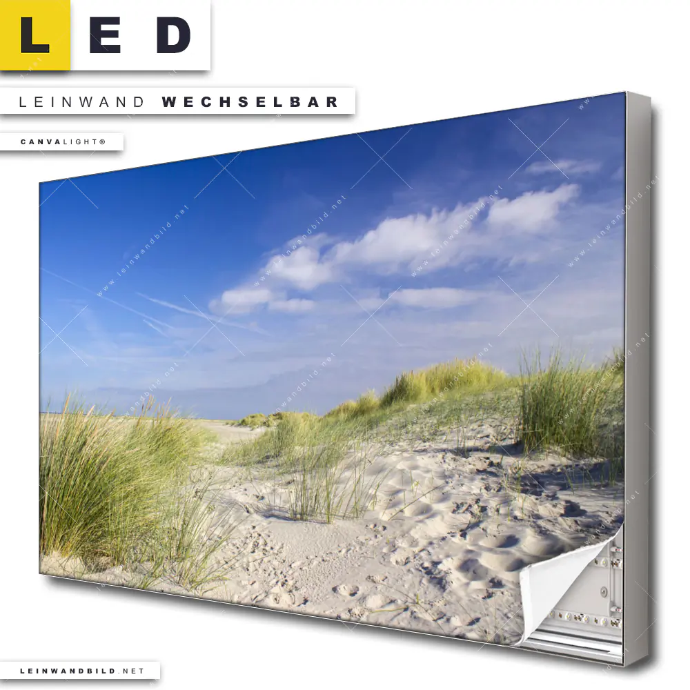 Du bist auf der Suche nach einem Landschaften, Strand - Meer LED Leinwandbild im Querformat? Begriffe wie Deutschland, Sommer, Dünen, Gräser, Urlaub, Reisen, Ostsee, Nordsee, Strand, Meer, Sand haben Dich auf der Suche nach Deinem neuen XXL LED Wandbild mit wechselbarer Leinwand inspiriert? Farben wie Beige, Blau, Grün dürfen auf Deinem neuen breiten Leinwand-LED-Bild nicht fehlen und Leuchtbilder im Natürlich - Realistisch Stil passen perfekt zu Deinem Einrichtungsstil?