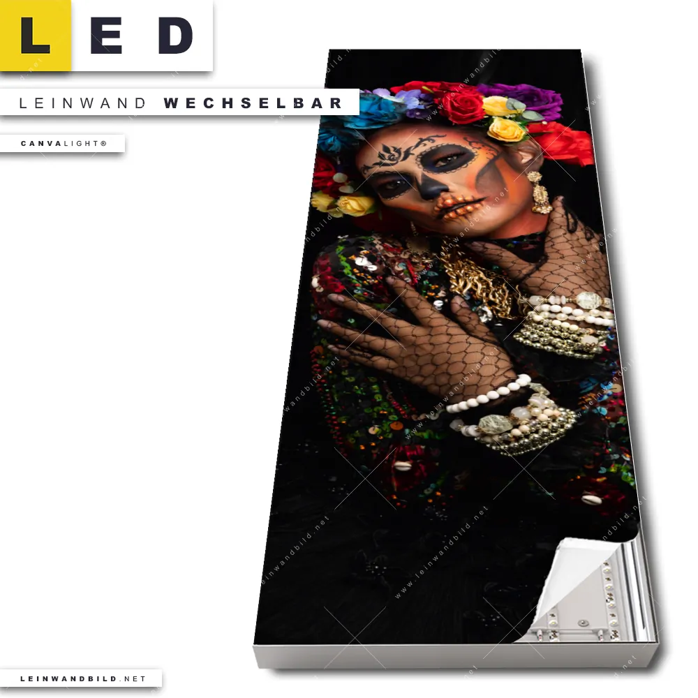 Du konfigurierst Dein individuelles LED Leinwandbild Canvalight® TEX | La Calavera Catrina No.2 | Schmal und wir produzieren es NEU für Dich. Unsere Porträts - Menschen LED Bilder mit wechselbarer Textil-Leinwand sind KEINE Lagerware. Du bist Dir unsicher, welches Motiv oder Format das richtige für dein individuelles Canvalight® Leuchtbild ist, dann helfen wir dir gerne weiter und beraten dich!
