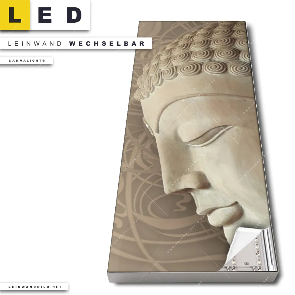Du bist auf der Suche nach einem Buddha - Feng Shui LED Leinwandbild im Schmalen Format? Begriffe wie Buddhismus, Religion, Zen, Meditation, Buddha haben Dich auf der Suche nach Deinem neuen XXL LED Wandbild mit wechselbarer Leinwand inspiriert? Farben wie Beige, Weiss, Gold dürfen auf Deinem neuen Leinwand-LED-Bild im Panorama-Hochformat nicht fehlen und Leuchtbilder im Modern Art Stil passen perfekt zu Deinem Einrichtungsstil?