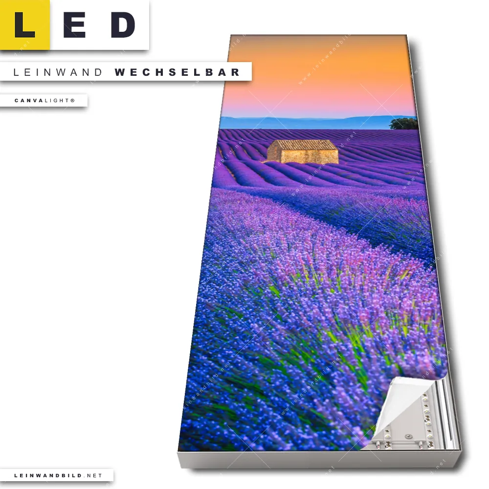 Du konfigurierst Dein individuelles LED Leinwandbild Canvalight® TEX | Lavendel Blumen Feld | Schmal und wir produzieren es NEU für Dich. Unsere Landschaften LED Bilder mit wechselbarer Textil-Leinwand sind KEINE Lagerware. Du bist Dir unsicher, welches Motiv oder Format das richtige für dein individuelles Canvalight® Leuchtbild ist, dann helfen wir dir gerne weiter und beraten dich!