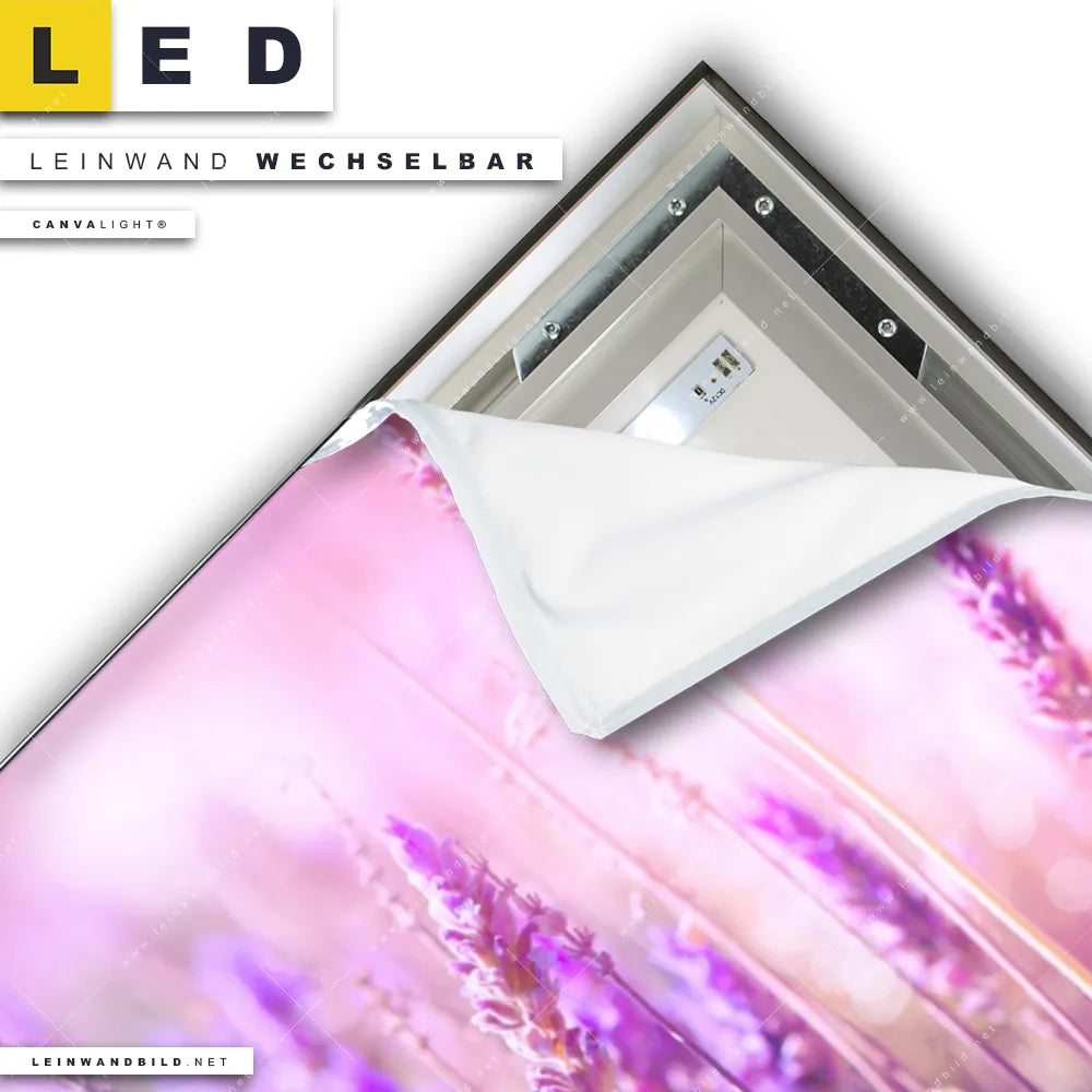 Du konfigurierst Dein individuelles LED Leinwandbild Canvalight® TEX | Lavendelblütenfeld | Hochformat und wir produzieren es NEU für Dich. Unsere Blumen - Botanik, Landschaften LED Bilder mit wechselbarer Textil-Leinwand sind KEINE Lagerware. Du bist Dir unsicher, welches Motiv oder Format das richtige für dein individuelles Canvalight® Leuchtbild ist, dann helfen wir dir gerne weiter und beraten dich!