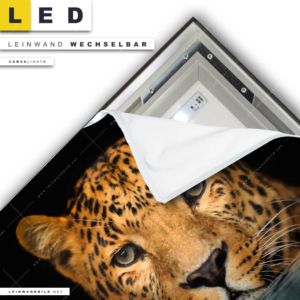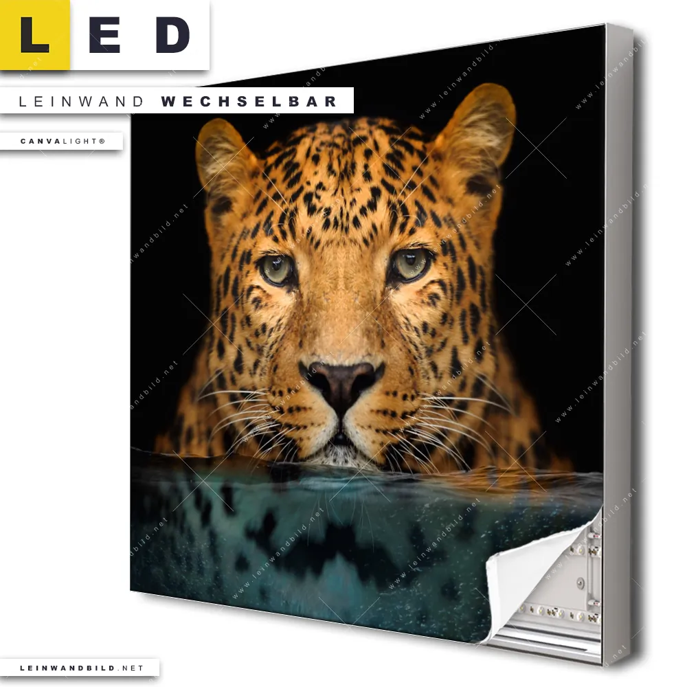 Du konfigurierst Dein individuelles LED Leinwandbild Canvalight® TEX | Leopard im Wasser | Quadrat und wir produzieren es NEU für Dich. Unsere Tierwelt LED Bilder mit wechselbarer Textil-Leinwand sind KEINE Lagerware. Du bist Dir unsicher, welches Motiv oder Format das richtige für dein individuelles Canvalight® Leuchtbild ist, dann helfen wir dir gerne weiter und beraten dich!