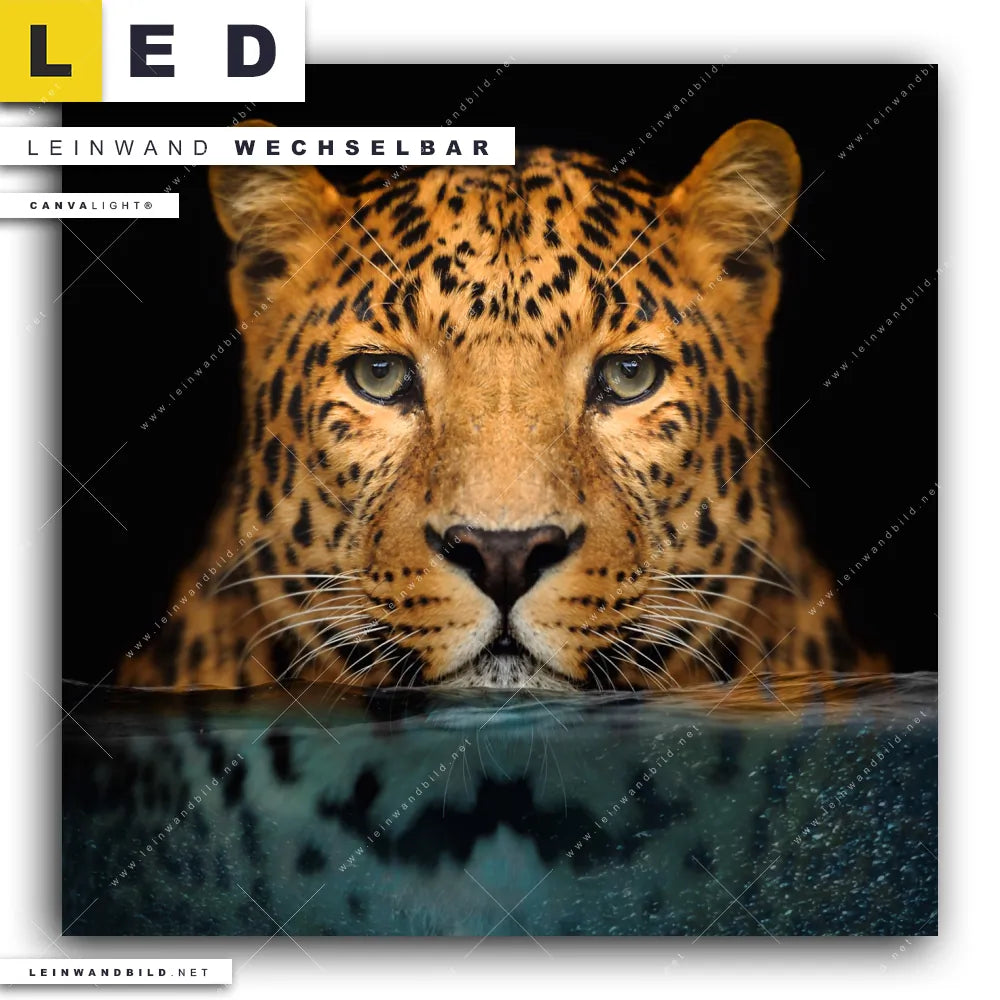 Du bist auf der Suche nach einem Tierwelt LED Leinwandbild im Quadratischen Format? Begriffe wie Raubkatze, Leopard, Afrika, Dschungel, Wasser, wild, Safari, Unterwasser, Wildkatze haben Dich auf der Suche nach Deinem neuen XXL LED Wandbild mit wechselbarer Leinwand inspiriert? Farben wie Schwarz, Beige dürfen auf Deinem neuen Leinwand-LED-Bild nicht fehlen und Leuchtbilder im Modern Art, Mixed Media Stil passen perfekt zu Deinem Einrichtungsstil?