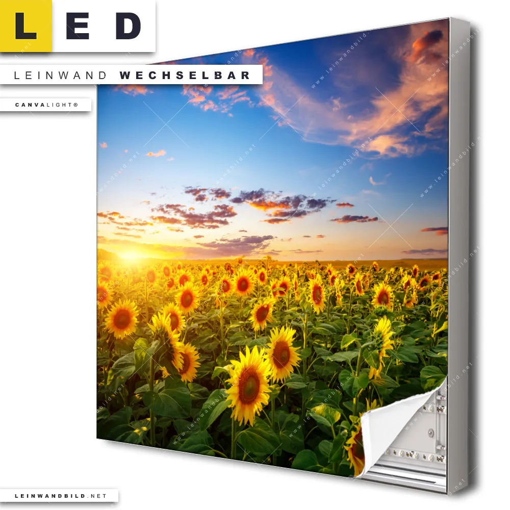 Du bist auf der Suche nach einem Landschaften, Blumen - Botanik LED Leinwandbild im Quadratischen Format? Begriffe wie Natur, Feld, Blumen, Blüten, Pflanzen, Blumenwiese, Sonnenblume, Sonnenuntergang haben Dich auf der Suche nach Deinem neuen XXL LED Wandbild mit wechselbarer Leinwand inspiriert? Farben wie Grün, Orange, Blau dürfen auf Deinem neuen Leinwand-LED-Bild nicht fehlen und Leuchtbilder im Floral Stil passen perfekt zu Deinem Einrichtungsstil?
