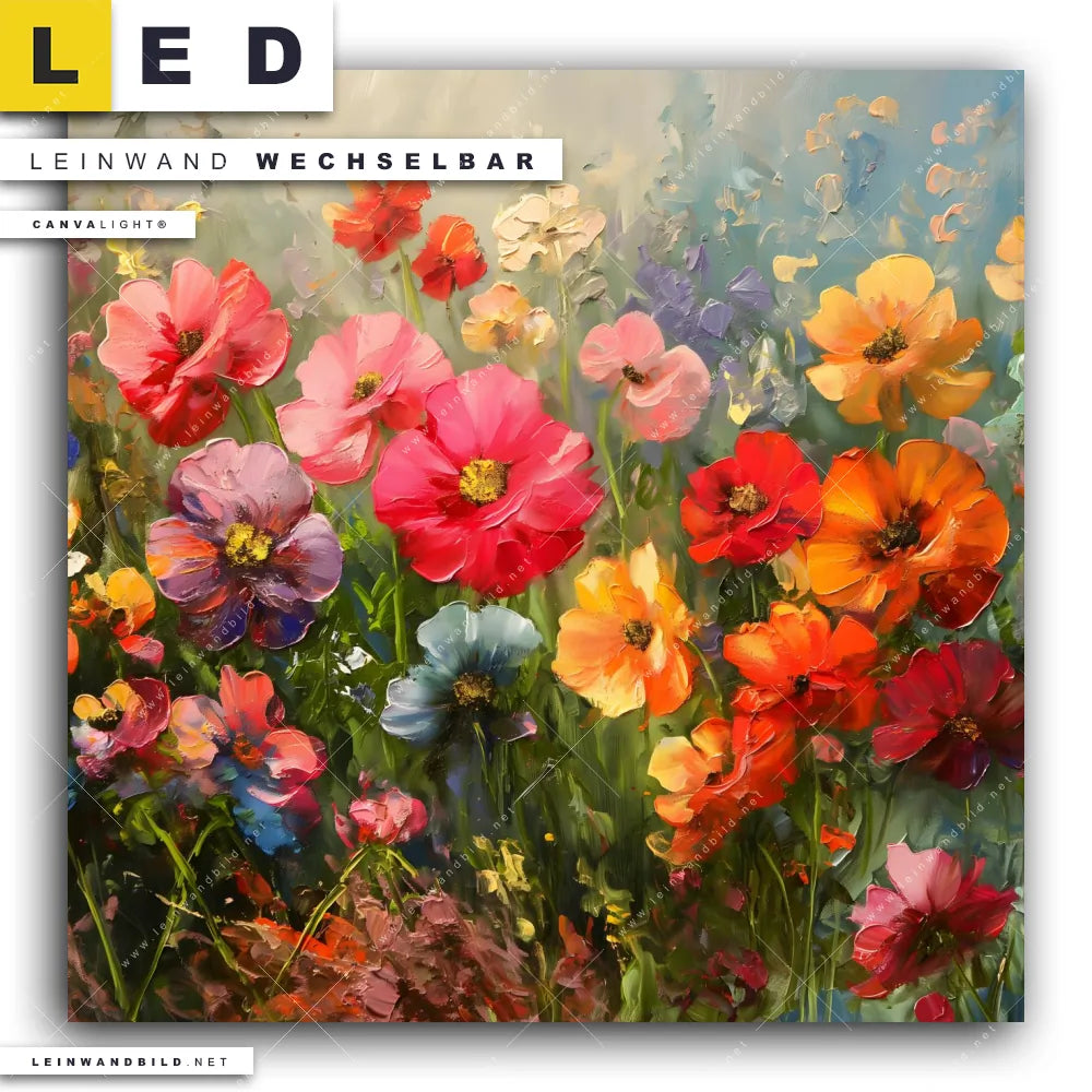 Du bist auf der Suche nach einem Blumen - Botanik LED Leinwandbild im Quadratischen Format? Begriffe wie Natur, Blüten, Blumen, Blumenwiese, Pflanze haben Dich auf der Suche nach Deinem neuen XXL LED Wandbild mit wechselbarer Leinwand inspiriert? Farben wie Blau, Orange, Grün, Gelb dürfen auf Deinem neuen Leinwand-LED-Bild nicht fehlen und Leuchtbilder im Floral, Abstrakt Stil passen perfekt zu Deinem Einrichtungsstil?
