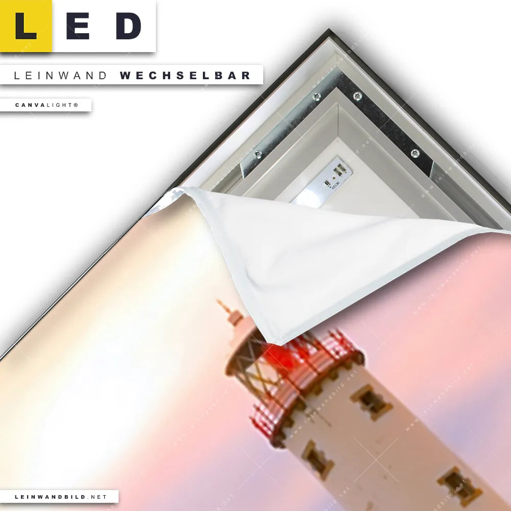 Du konfigurierst Dein individuelles LED Leinwandbild Canvalight® TEX | Leuchtturm bei stürmischer See | Schmal und wir produzieren es NEU für Dich. Unsere Strand - Meer, Landschaften LED Bilder mit wechselbarer Textil-Leinwand sind KEINE Lagerware. Du bist Dir unsicher, welches Motiv oder Format das richtige für dein individuelles Canvalight® Leuchtbild ist, dann helfen wir dir gerne weiter und beraten dich!