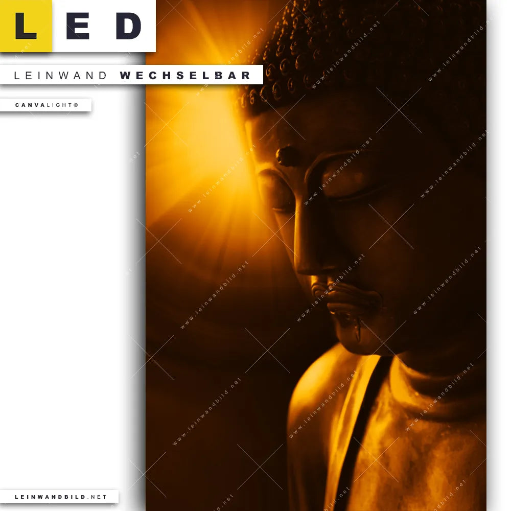 Du bist auf der Suche nach einem Buddha - Feng Shui LED Leinwandbild im Hochformat? Begriffe wie Buddha, Buddhismus, Religion, Feng Shui, Zen, Meditation, Licht, Weisheit, Erleuchtung haben Dich auf der Suche nach Deinem neuen XXL LED Wandbild mit wechselbarer Leinwand inspiriert? Farben wie Schwarz, Gold dürfen auf Deinem neuen Leinwand-LED-Bild nicht fehlen und Leuchtbilder im Minimalistisch Stil passen perfekt zu Deinem Einrichtungsstil?