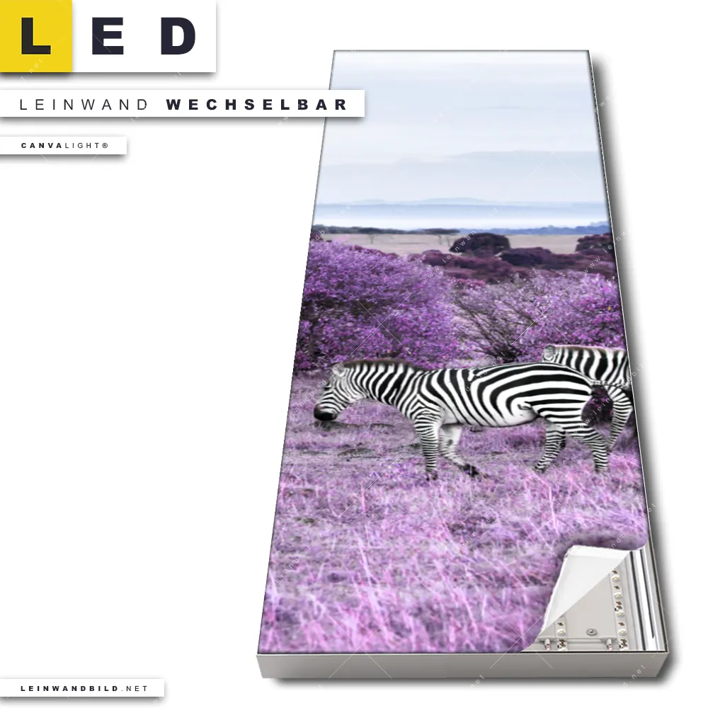 Du bist auf der Suche nach einem Tierwelt, Landschaften LED Leinwandbild im Schmalen Format? Begriffe wie Wald, Landschaft, Bäume, Natur, Afrika, Savanne, Zebra haben Dich auf der Suche nach Deinem neuen XXL LED Wandbild mit wechselbarer Leinwand inspiriert? Farben wie Lila, Schwarz, Weiss, Hellblau dürfen auf Deinem neuen Leinwand-LED-Bild im Panorama-Hochformat nicht fehlen und Leuchtbilder im Modern Art Stil passen perfekt zu Deinem Einrichtungsstil?