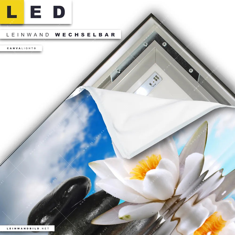 Du konfigurierst Dein individuelles LED Leinwandbild Canvalight® TEX | Lilie & Zensteine | Quadrat und wir produzieren es NEU für Dich. Unsere Buddha - Feng Shui, Blumen - Botanik LED Bilder mit wechselbarer Textil-Leinwand sind KEINE Lagerware. Du bist Dir unsicher, welches Motiv oder Format das richtige für dein individuelles Canvalight® Leuchtbild ist, dann helfen wir dir gerne weiter und beraten dich!
