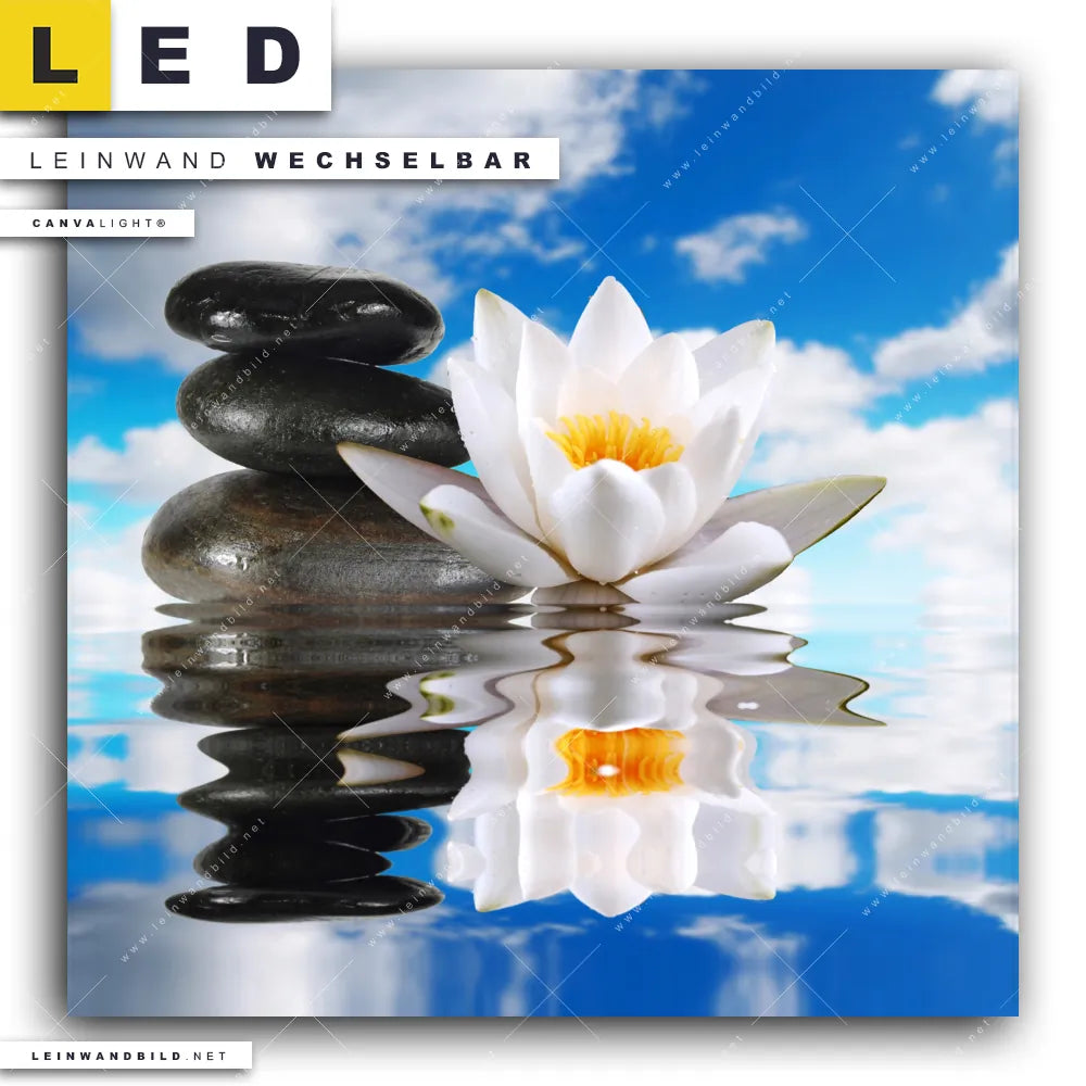 Du bist auf der Suche nach einem Buddha - Feng Shui, Blumen - Botanik LED Leinwandbild im Quadratischen Format? Begriffe wie Buddhismus, Religion, Feng Shui, Zen, Meditation, Steine, Zensteine, Turm, gestapelt, Wasser, Spiegelung, Wasserspiegelung, Blume, Blüte, Lilie, Himmel, Wolken haben Dich auf der Suche nach Deinem neuen XXL LED Wandbild mit wechselbarer Leinwand inspiriert? Farben wie Blau, Weiss, Schwarz dürfen auf Deinem neuen Leinwand-LED-Bild nicht fehlen und Leuchtbilder im Mixed Media, Modern Art, Floral Stil passen perfekt zu Deinem Einrichtungsstil?